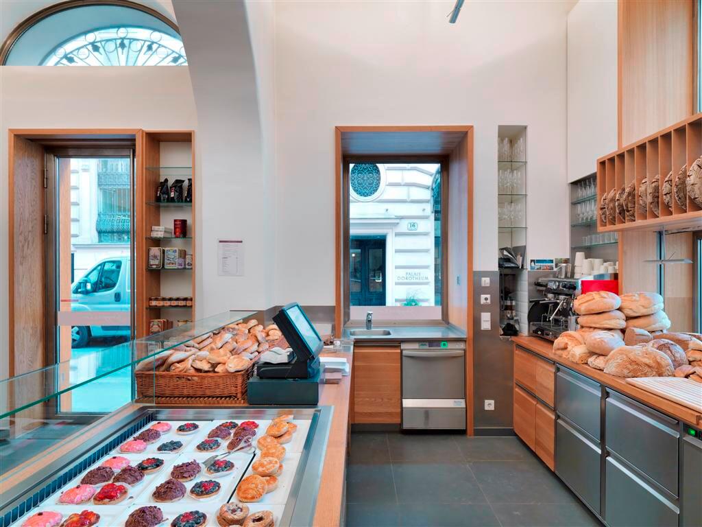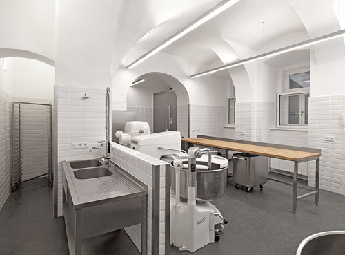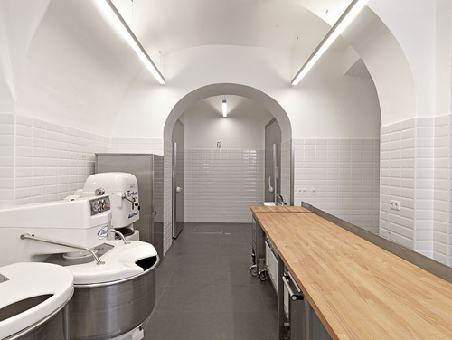 Schlichte Materialität und reduzierte formale Gestaltung sind Konsequenzen einer Haltung, die nicht darauf setzt, die Architektur zu inszenieren, sondern das Produkt durch sie wirken zu lassen: Stahl, Stein und Holz beziehen hier ihre Wirkung aus der Kombination mit den verschiedenen Brauntönen der Semmeln, Baguettes, Brotlaibe und Tartines. Zu dieser Haltung gehört es auch, die der Öffentlichkeit verborgen bleibende Backstube nach denselben Prinzipien zu behandeln wie den Verkaufsraum: Der anthrazitgraue Feinsteinzeug-Plattenboden zieht sich durch alle Räume, die historischen Gewölbe wurden überall erhalten, und der schmale Gang zwischen Backstube und Ofen ist sogar ganz besonders charmant: Mit seinen querrechteckigen weißen Wandfliesen erinnert er an die Pariser Metro und betont damit den frankophilen Touch der Bäckerei. Seine durch den jahrhundertealten Bestand gegebenen Ecken, Kanten und Krümmungen durfte der Gang behalten. Wo nötig, wurden die Fliesen an den Rundungen einfach hochkant verlegt.