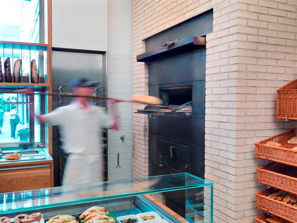 Die frischen Brote werden zum Auslüften in einem Eichenregal über Kopfhöhe stehend gelagert, an der rechten Wand läuft ein Holzstehtisch mit Barhockern entlang, an dem man das kleine Essensangebot konsumieren kann. Eine beschreibbare wandbreite Schiefertafel kann als Speisekarte fungieren, ist aber gleichzeitig als Wandbekleidung mit ihrer dezenten Struktur fast schon ornamental.