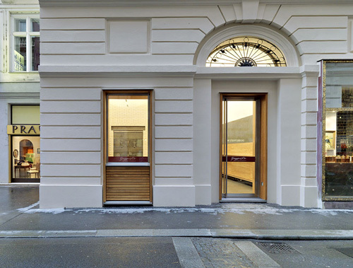 Es lag daher nahe – und fand auch die Zustimmung des Denkmalamts –, diese Öffnung zu vergrößern und das kleine Geschäftslokal damit zweiseitig zu belichten. Zusätzlich bietet sich dadurch ein schönes innerstädtisches Panorama die enge Spiegelgasse entlang bis zum Graben. Der baufällige alte Vorbau wurde entfernt und damit die architektonische Struktur der Hausfassade wieder freigelegt, inklusive einem halbrunden Lünettenfenster über dem Geschäftseingang, das der Vorbau verdeckt hatte. Radatz entschied sich damit bewusst für eine Strategie des Freilegens und des teilweisen Rückbaus nach dem – mit dem der Bäckerei durchaus vergleichbaren – einfachen Grundsatz: „Was alt und gut ist, bleibt, der Rest kann weg.“