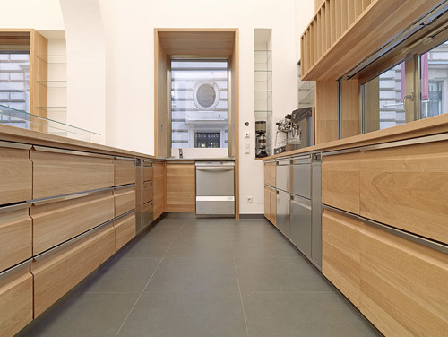 Schlichte Materialität und reduzierte formale Gestaltung sind Konsequenzen einer Haltung, die nicht darauf setzt, die Architektur zu inszenieren, sondern das Produkt durch sie wirken zu lassen: Stahl, Stein und Holz beziehen hier ihre Wirkung aus der Kombination mit den verschiedenen Brauntönen der Semmeln, Baguettes, Brotlaibe und Tartines. Zu dieser Haltung gehört es auch, die der Öffentlichkeit verborgen bleibende Backstube nach denselben Prinzipien zu behandeln wie den Verkaufsraum: Der anthrazitgraue Feinsteinzeug-Plattenboden zieht sich durch alle Räume, die historischen Gewölbe wurden überall erhalten, und der schmale Gang zwischen Backstube und Ofen ist sogar ganz besonders charmant: Mit seinen querrechteckigen weißen Wandfliesen erinnert er an die Pariser Metro und betont damit den frankophilen Touch der Bäckerei. Seine durch den jahrhundertealten Bestand gegebenen Ecken, Kanten und Krümmungen durfte der Gang behalten. Wo nötig, wurden die Fliesen an den Rundungen einfach hochkant verlegt.