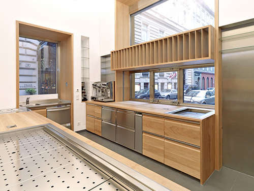 Die unterschiedlichen Wege, mit einer historischen Fassade umzugehen, lassen sich an der symmetrischen Front des Hauses vergleichen: Beim Geschäftsumbau rechts vom Hauseingang wurde der unverändert gebliebenen Fassade eine Glashaut vorgesetzt, wie man es auch in den Dreißigerjahren gerne machte, während Radatz die alte Struktur von Wand und Öffnung beibehielt. Neu formuliert wurde vor allem das Fenster zur seitlichen Feuermauer. An der mittels Eichenlatten optisch bis auf den Boden gezogenen Öffnung erlaubt ein Schiebefenster den Gassenverkauf mit Konsumationsmöglichkeit an zwei Stehtischen im Straßenzwickel.