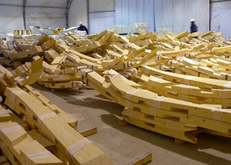 Bereits dort hatte das Schweizer Ingenieurteam Création Holz das Holzdach geplant und berechnet. Mit den dabei gemachten Erfahrungen waren beim Clubhaus in Yeoju neue Ufer zu betreten. Dabei wurde ein Verbindungskonzept mit paarweisen Überblattungen entwickelt, das nicht nur eine Neuheit, sondern sogar der Schlüssel für die Realisierbarkeit dieses Projektes war, das anfangs als unausführbar gegolten hatte. Als Verbindungsmittel kamen lediglich Schrauben und Verklebungen für die Schubübertragungen in den Lagen und den Kreuzungspunkten zur Anwendung. Auch wenn es sich in diesem Fall also nicht um reine Holz-Holz-Verbindungen handelt, ist Hermann Blumer von Creátion Holz doch davon überzeugt, dass ein derartiges System künftig auch mit Holzdübeln konstruierbar sein wird.