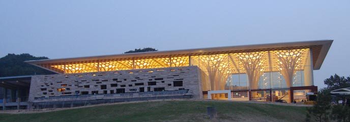 Die Anlage des Nine Bridges Golf Resort im südkoreanischen Yeoju besteht aus drei Gebäudekomplexen: einem Clubhaus für reguläre Mitglieder, einem Trakt für vip-Mitglieder und den Empfangsräumen für vvips. Jeder Bauteil ist unterschiedlich konstruiert. Das baulich prägende Clubhaus besteht aus einer Holzkonstruktion, die in ihrer Grundform auf das traditionelle »bamboo wife« zurückgeht, ein für Korea typisches, aus Spänen geflochtenes Sommerkissen. Der VVIP-Teil ist weitgehend eine Stahlkonstruktion, im VIP-Trakt finden sich zudem Betonstrukturen. Alle Bauten beziehen sich in zeitgemässer Form auf tradierte Architekturformen Koreas.