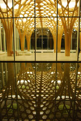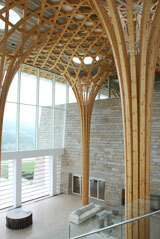 Das Clubhaus sieht aus wie ein streng geometrisch ausgerichteter »Wald«. 21 Baumstützen tragen die Dachfläche von 36 mal 72 Meter. Das lastabtragende »Astgeflecht« der Kronen verläuft bis in das 4,50 Meter breite Vordach. Die gesamte Höhe der Konstruktion misst 13,60 Meter. Wie in der Natur, so ist auch bei dieser Konstruktion kein Stab gerade. Sämtliche Flächen sind zumindest einfach, grossteils zweifach gekrümmt. Auf den Kronen ruht ein Trägerrost mit Haupt- und Nebenträgern, in den 21 Lichtkuppeln mit einem Durchmesser von 3 Metern integriert sind. Den oberen Abschluss der Holzkonstruktion bildet eine Dreischichtplatte. Die Baumstützen dienen als tragendes Element für das Dach, lassen mit ihrer transparenten Konstruktion aber zugleich Tageslicht in die Räume fliessen und sorgen für eine natürliche Entlüftung des Raumes.