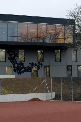 Fassadendetail mit „Tattoo“, eines der drei Projekte, die der Künstler Wilhelm Scherübl für den am Sportpark Lissfeld entwickelte. „Bei ersterem Projekt ging er vom Ast eines Ginkobaumes aus. Scherübl spiegelte dessen Form und übertrug sie anschließend auf die Fassade, indem er nach einer Sandabstrahlung der Beton- und Glasflächen die Silhouette mit schwarzer Farbe fasste.“ (Dr. Martin Hochleitner)
