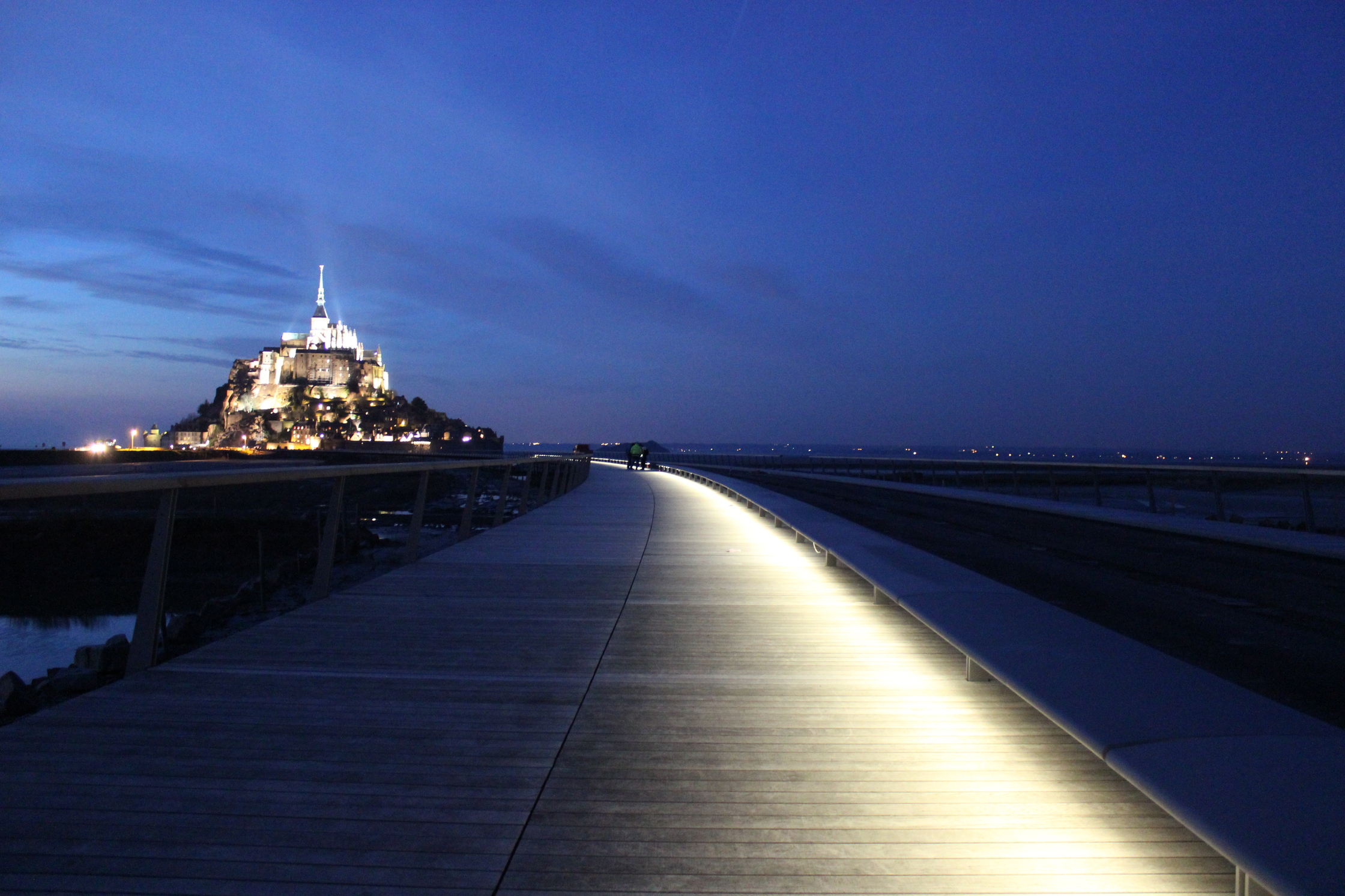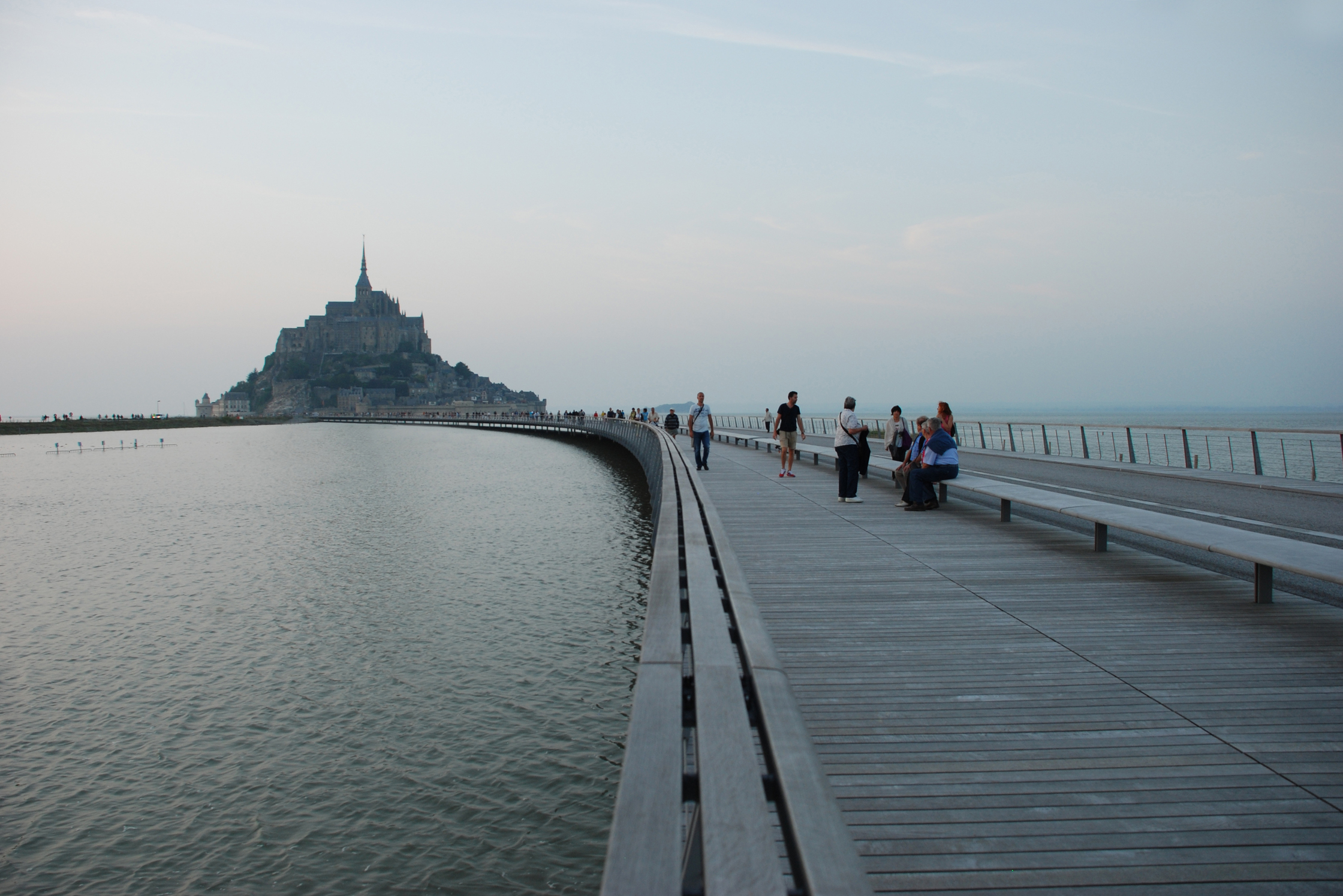 Und klick. Ohne jeden Zweifel gilt die Hauptaufmerksamkeit dem romanischen Mont Saint-Michel, der sich nach einer leichten Linkskurve auf halbem Wege in seiner vollen Pracht vor der Passerelle aufbäumt. Die Brücke wird zu diesem Zeitpunkt unsichtbar. Unauffällig duckt sie sich ins Naturschutzgebiet und begnügt sich bei all ihrer Schönheit und konstruktiven Ästhetik wohlwollend mit dem zweiten Platz.