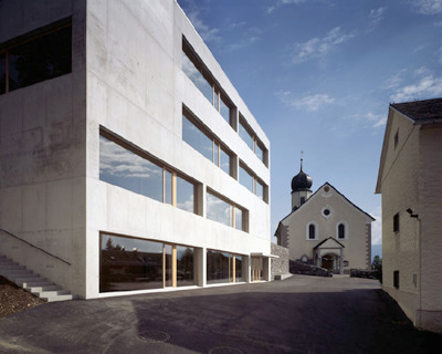 Man muss sich vorstellen, dass der Bauplatz ziemlich klein ist. Es stand dort eine Volksschule, die aber in so schlechtem Zustand war, dass sie auf jeden Fall abgerissen werden musste. Schwierig war allerdings das Programm: Turnhalle, Kindergarten, Räume für die Lehrer, Mehrzweckraum, vier Klassenzimmer, zwei Werkräume - das ist nicht ganz leicht unterzubringen, wenn man kaum Platz hat. Das Kinderhaus von Roland Gnaiger wurde daher auch für den Abbruch freigegeben. „Cukrowicz.Nachbaur Architekten“ haben von dieser Möglichkeit - man möchte sagen „natürlich“, denn es handelt sich um eine architektonische Ehrensache unter Kollegen - keinen Gebrauch gemacht. Sie haben vielmehr ein unheimlich kompaktes Gebäude entwickelt, das all die unterschiedlichen Funktionen auf fünf Geschoßen - im Dorf an sich eine unmögliche Gebäudehöhe - unterbringt, aber mit so viel Geschick, auch unter Ausnutzung der Hanglage, dass selbst vom tiefsten Punkt an der Straße nur vier Geschoße sichtbar sind.