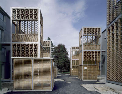 Das Besondere an der Siedlung sind jedoch die zweigeschossigen Laubentürme, die als Gartenersatz zwischen den Häuserzeilen stehen. Die schlichten Stahlkonstruktionen evozieren mit ihren Ausfachungen aus kreuzweise diagonal angeordneten Lärchenholzleisten Bilder traditioneller Gartenarchitekturen, obschon sie in dieser Form neuartig sind. Sie lösen das Problem des privaten Aussenraums in einer stark verdichteten Überbauung und verleihen dieser einen unverwechselbaren Charakter. Hier zeigt sich die Stärke des Architekten Frank Zierau. Er entwickelt seine Entwürfe frei von Ideologien, streng bezogen auf Funktion und Benutzer. Dabei geht er die Entwurfsprobleme offensiv an, was zu unkonventionellen, innovativen Lösungsansätzen führt.