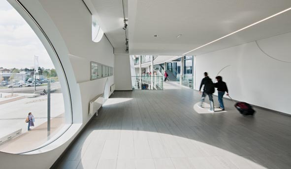 Alle Stammklassen sind nach außen orientiert, alle Sonderräume zum Hof. In den fast überbreiten Gängen finden sich immer wieder Sitznischen, auf dem Boden liegt ein gelber Kunststoffbelag, die Grundstimmung ist – auch durch das Spielerische der Linsenelemente und der Fensterlinsen an den Gangenden – ausgesprochen freundlich.
