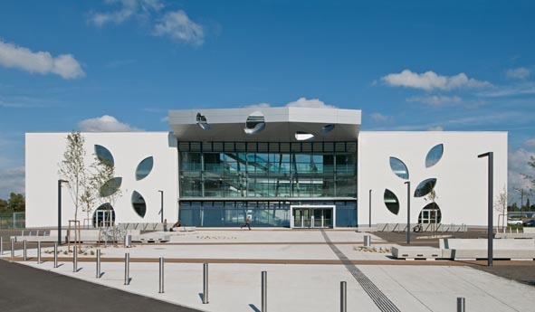 Städtebaulich war die Situation eindeutig. Der Haupteingang ist an der Ecke zur Aspernstraße situiert, allerdings wurde das Gebäude sehr weit zurückgesetzt, sodass ein großer öffentlicher Vorplatz entstand. Das war schon aus Sicherheitsgründen (Verkehr) wichtig. Es steigert aber auch die Wirkung der markanten Front mit ihrer gläsernen Mitte, die durch eine Art „Vordachplastik“ bekrönt ist, und den beiden Seitentrakten, in die linsenförmige Öffnungen geschnitten sind. Diese Linsenformen sind das dekorative Leitmotiv, auf das man im ganzen Haus trifft: Oft sind sie verglast und setzen in den langen Erschließungsgängen einen wichtigen Akzent, weil sie Licht hereinholen und Ausblicke ermöglichen; oft sind sie aber auch reine „Dekoration“, gezielt platzierte Elemente, die zeigen, was unter der weißen Oberfläche der ziemlich massiven konstruktiven Wände (60 Zentimeter) ist – Ortbeton. Und in einem Fall, im Festsaal, sind diese Linsen „blind“, also weiß wie die Wand. Übrigens zeigen die Architekten den rohen Beton auch in den Klassen und etwa im Festsaal jeweils als viereckige Ausnehmung an der Decke.