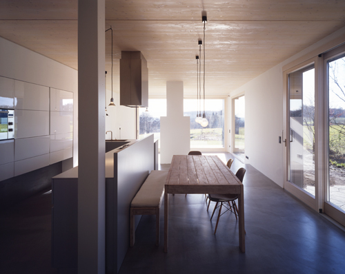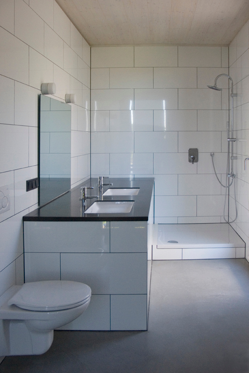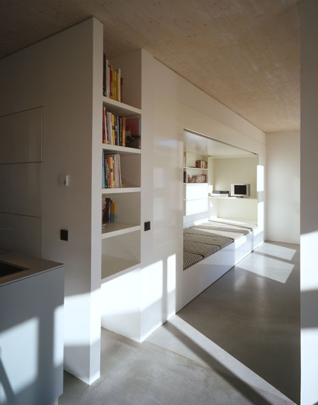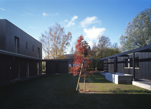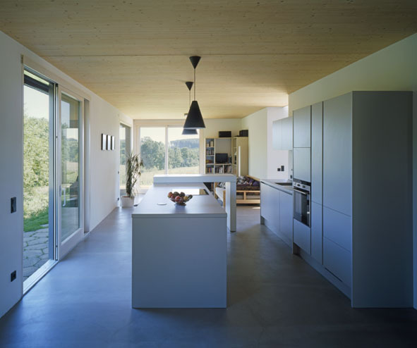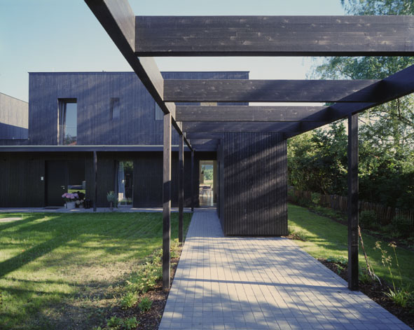 Der Sinn für das Pragmatische beginnt beim Carport, der eine gute, weil elegantere und preiswertere Alternative zu den dicken Garagen ist, die ansonsten wie gutartige, aber hässliche Geschwülste die Siedlungen durchsetzen. Ihn so breit wie möglich auszubilden ist angemessen in einer Lage, die ohne Auto schwer zu erreichen ist. Abstellräume und eine Werkstatt sind nicht in ein Kellergeschoß verbannt, sondern liegen dort, wo man sie braucht und täglich vorbeikommt. Verbunden und begleitet von einer Pergola, umfassen sie einen grünen Hof, der als Pufferzone zur Straße ebenso wirksam ist, wie er sich als umgrenzter sichtgeschützter Platz zum Spielen, Feste feiern oder Herumwerkeln nützlich macht. Er ist ein Schwellenbereich, der Besucher langsam an das Haus heranführt und den Bewohnern Zeit gibt, sich auf die Ankommenden vorzubereiten.