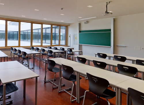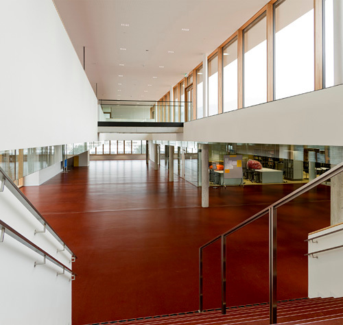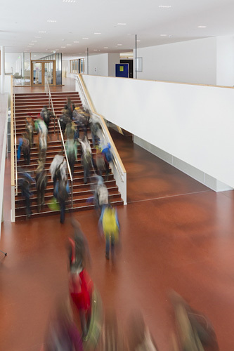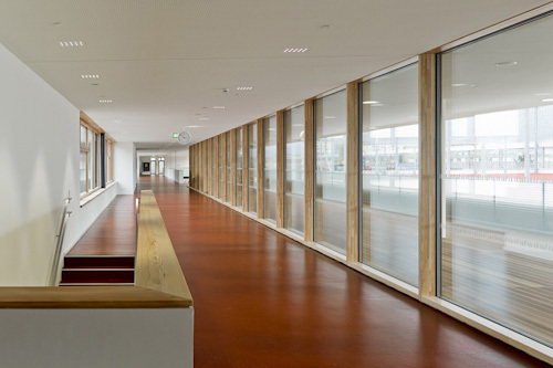 Tatsächlich konnten die Architekten fast alles, was sie im Wettbewerbsprojekt vorgeschlagen haben, umsetzen. Energetisch erfüllt es den Passivhausstandard. Bei der Einrichtung wurde erfolgreich für eine Qualität jenseits des Üblichen gekämpft. Nur bei den Bodenbelägen musste das gewünschte Holz mehrheitlich einem angeblich pflegeleichteren Naturkautschuk weichen. Außerdem gibt es keine Zentralgarderobe, damit wäre das Flächenlimit für eine solche Schule überschritten worden, und auch hier – kein Holz für die Spinde, sondern nur Blech.