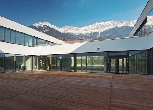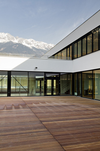 Um es vorsichtig zu formulieren: Die Kombination ist einigermaßen überraschend. Der Innsbrucker Architekt Helmut Reitter – in Arbeitsgemeinschaft mit Eck & Reiter – hat mit dem „Q-West“ ein Bildungs- und Nahversorgungszentrum realisiert, bei dem auf einem Einkaufszentrum eine Schule platziert wurde. Auf Anhieb möchte man eigentlich sagen: Furchtbar, lauter kleine Konsumenten! Werden sie nicht früh genug dazu – muss das jetzt schon in der Schule sein? Wenn man aber vor Ort ist, versteht man sehr schnell, dass diese Verdächtigung nicht greift.