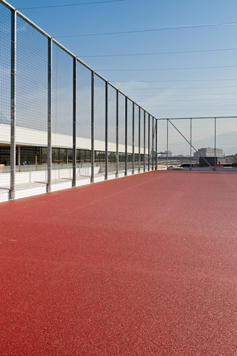 Die Schule umfasst – auf zwei Ebenen – immerhin 32 Stammklassen, ergänzt durch eine Vielzahl an Sonderklassen und räumlichen Angeboten aller Art. Wobei die Stammklassen in drei als Finger ausgebildeten Baukörpern angeordnet sind, die jeweils drei Atrien umschließen. Dorthin sind diese Stammklassen durchwegs orientiert. Vom Straßenlärm bekommt man hier nichts mit – Schallschutz war überhaupt eine Prämisse –,außerdem ist der Ausblick auf diese teilweise begrünten Höfe ausgesprochen attraktiv. Zum Thema Freiflächen: Sie fehlen hier nicht, im Gegenteil. Das Angebot an großzügigen, teilweise gedeckten Terrassen (4000 Quadratmeter), dazu ein riesiger Sportplatz auf dem Dach der Dreifachturnhalle, könnte nicht vielfältiger sein.