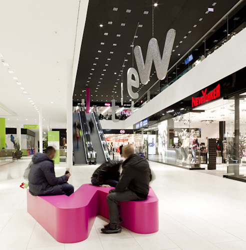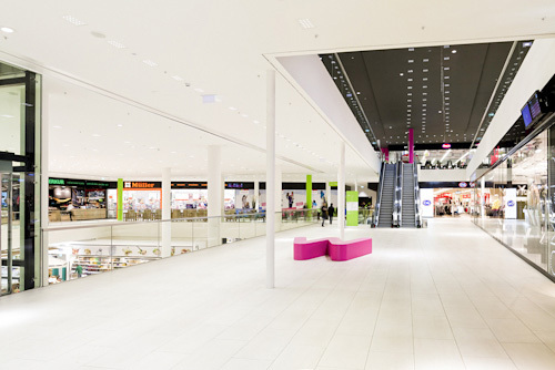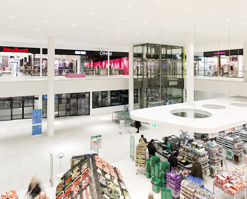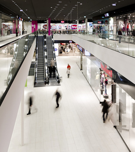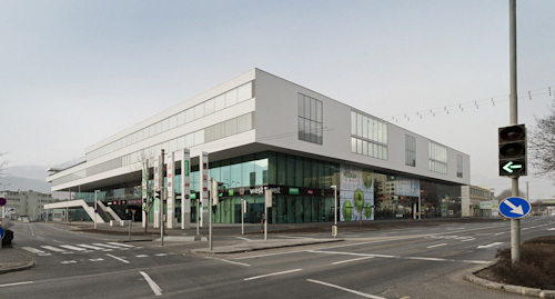 Über Einkaufszentren ist im Grund wenig zu sagen. Sie sind immer gleich, sie kämpfen immer mit den lauten Logos der Firmenketten, sie wollen übersichtlich sein. Es geht hier nicht anders zu als im Kaufhaus Tyrol, dem vornehmeren Konkurrenten, nur das Preisniveau ist etwas niedriger. Und der Investor – wieder einmal Herr Benko, wie beim Tyrol – hat es verstanden, aus der Tatsache, dass das zweite Parkgeschoß schon sehr weit im Grundwasser liegt, ein Mehr an Nutzungsfläche als Ausgleich für erschwerte Baubedingungen herauszuholen. Man muss offenbar sehr schnell rechnen können als Investor. Das Nutzflächenverhältnis beträgt jetzt 14.000 Quadratmeter Einkaufszentrum zu gut 12.000 Quadratmeter Schule.