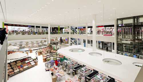 Und das ist wunderbar gelungen. Man ist hier wirklich mit zwei völlig getrennten Welten konfrontiert. Das Einkaufszentrum erstreckt sich über drei Ebenen, sehr übersichtlich, mit einer großzügigen Mall. Und beleuchtet durch einen höchst angenehmen „Sternenhimmel“ aus LED-Lampen, einer Entwicklung aus dem Studio Bartenbach, die hier und auch in der Schule zum ersten Mal in großem Umfang eingesetzt wurde.