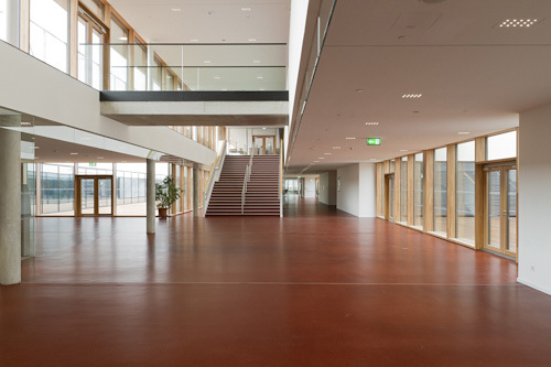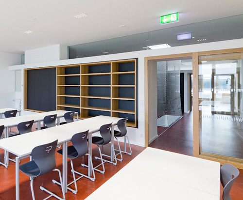 Tatsächlich konnten die Architekten fast alles, was sie im Wettbewerbsprojekt vorgeschlagen haben, umsetzen. Energetisch erfüllt es den Passivhausstandard. Bei der Einrichtung wurde erfolgreich für eine Qualität jenseits des Üblichen gekämpft. Nur bei den Bodenbelägen musste das gewünschte Holz mehrheitlich einem angeblich pflegeleichteren Naturkautschuk weichen. Außerdem gibt es keine Zentralgarderobe, damit wäre das Flächenlimit für eine solche Schule überschritten worden, und auch hier – kein Holz für die Spinde, sondern nur Blech.