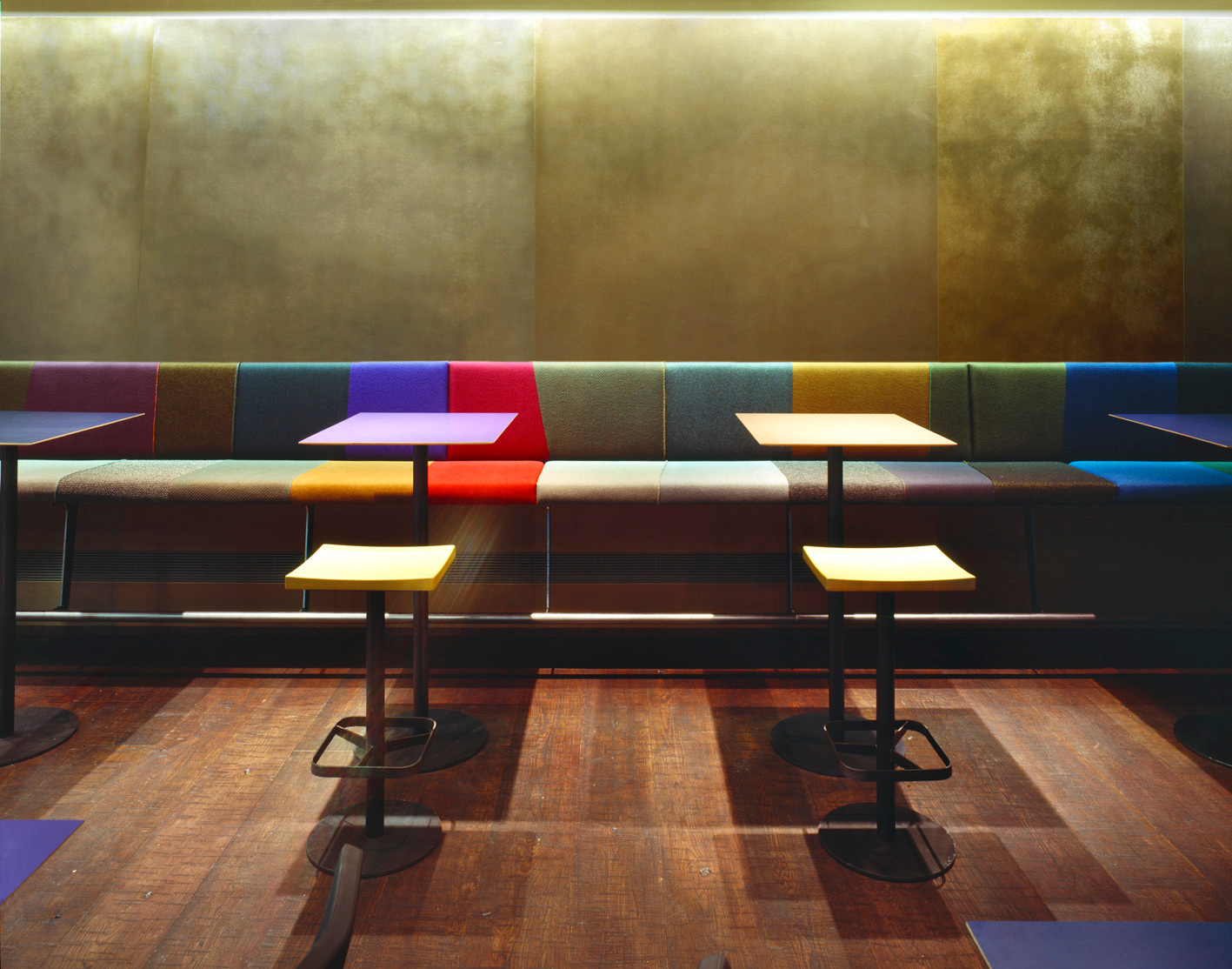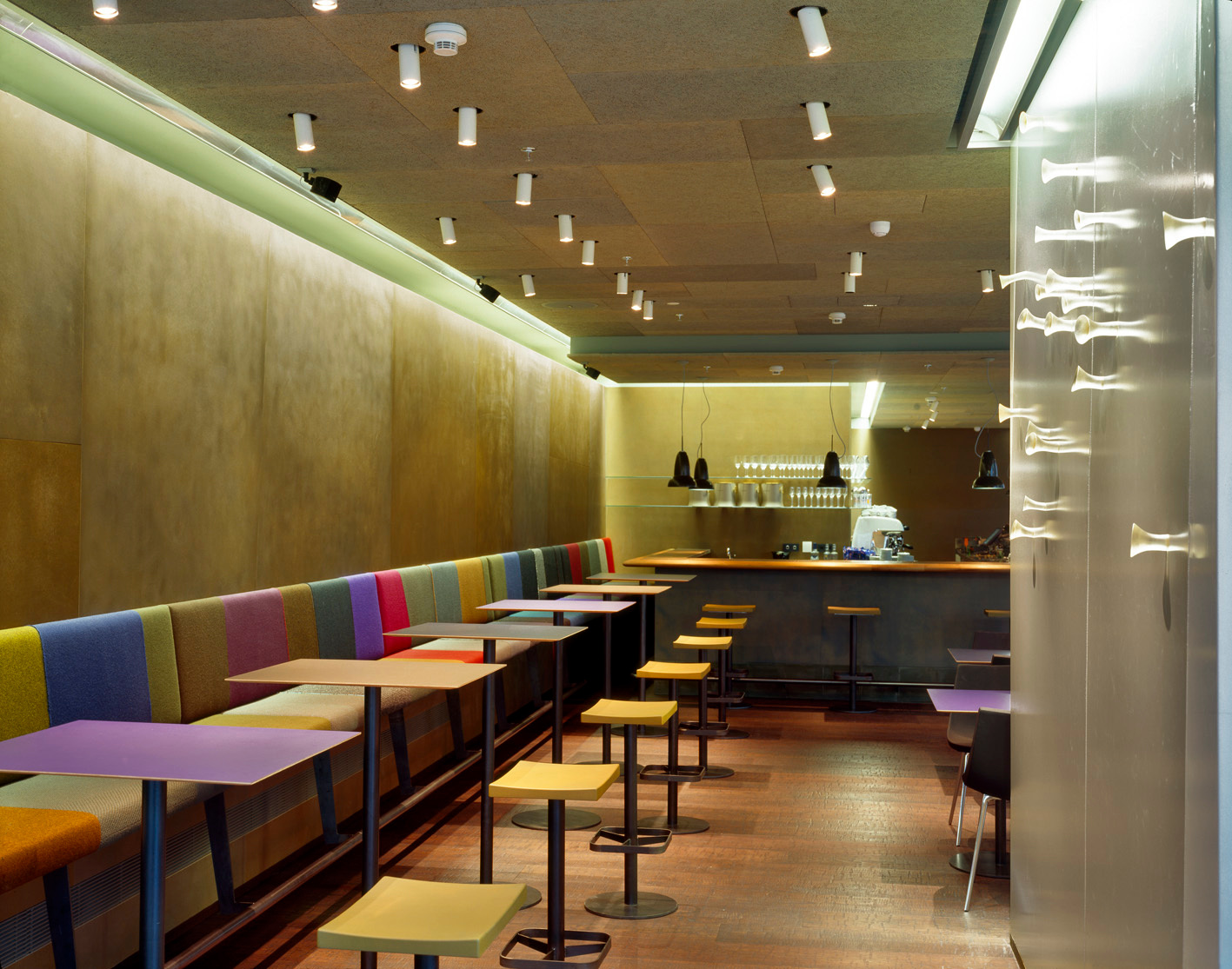 Henke und Schreieck beweisen mit diesem Projekt einmal mehr ihre Kompetenz im Blick aufs Ganze, vom städtebaulichen Konzept bis zum konstruktiven Detail. Dass sie auch mit feinen Zwischentönen umzugehen wissen, zeigt sich in der Bar der Weinhandlung, in der sie in Zusammenarbeit mit der Künstlerin Ursula Aichwalder die Inneneinrichtung gestaltet haben. Das Vokabular erweitert sich hier mit einer differenzierten Palette von Farben und einfachen Materialien in edler Verarbeitung, die der Aufgabe, eine Bar zu schaffen, die sowohl untertags als auch am Abend funktioniert, elegant gerecht wird.
