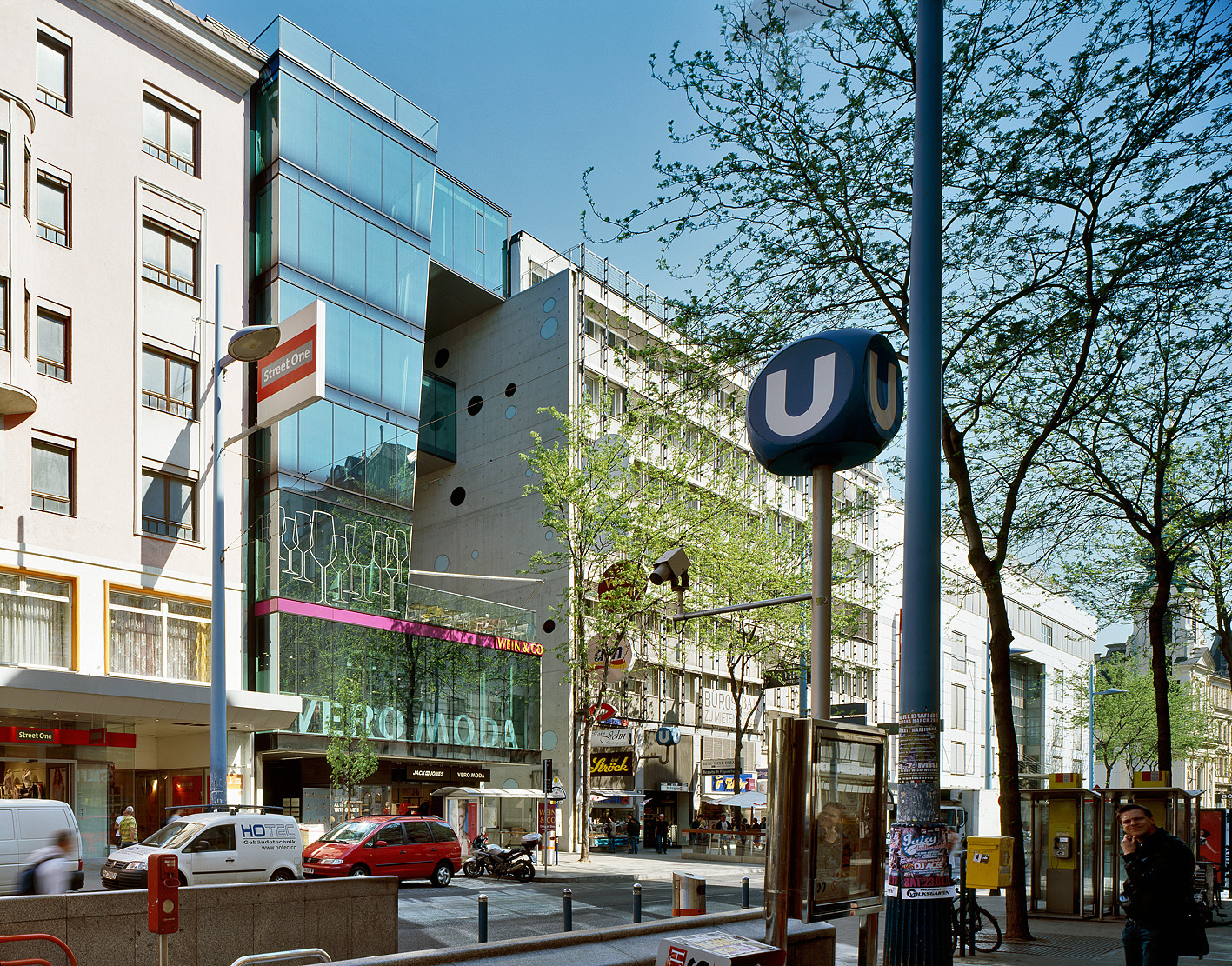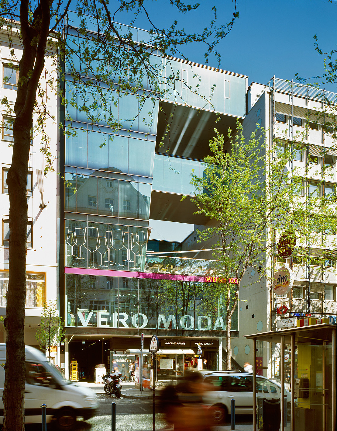 Kommerzielle Bauaufgabe, virtuos gelöst: Henke und Schreieck konzipierten eine „gläserne Box mit schrägem Anschnitt“ als Büro- und Geschäftshaus. Zu finden in der Mariahilfer Straße, Wien-Neubau.