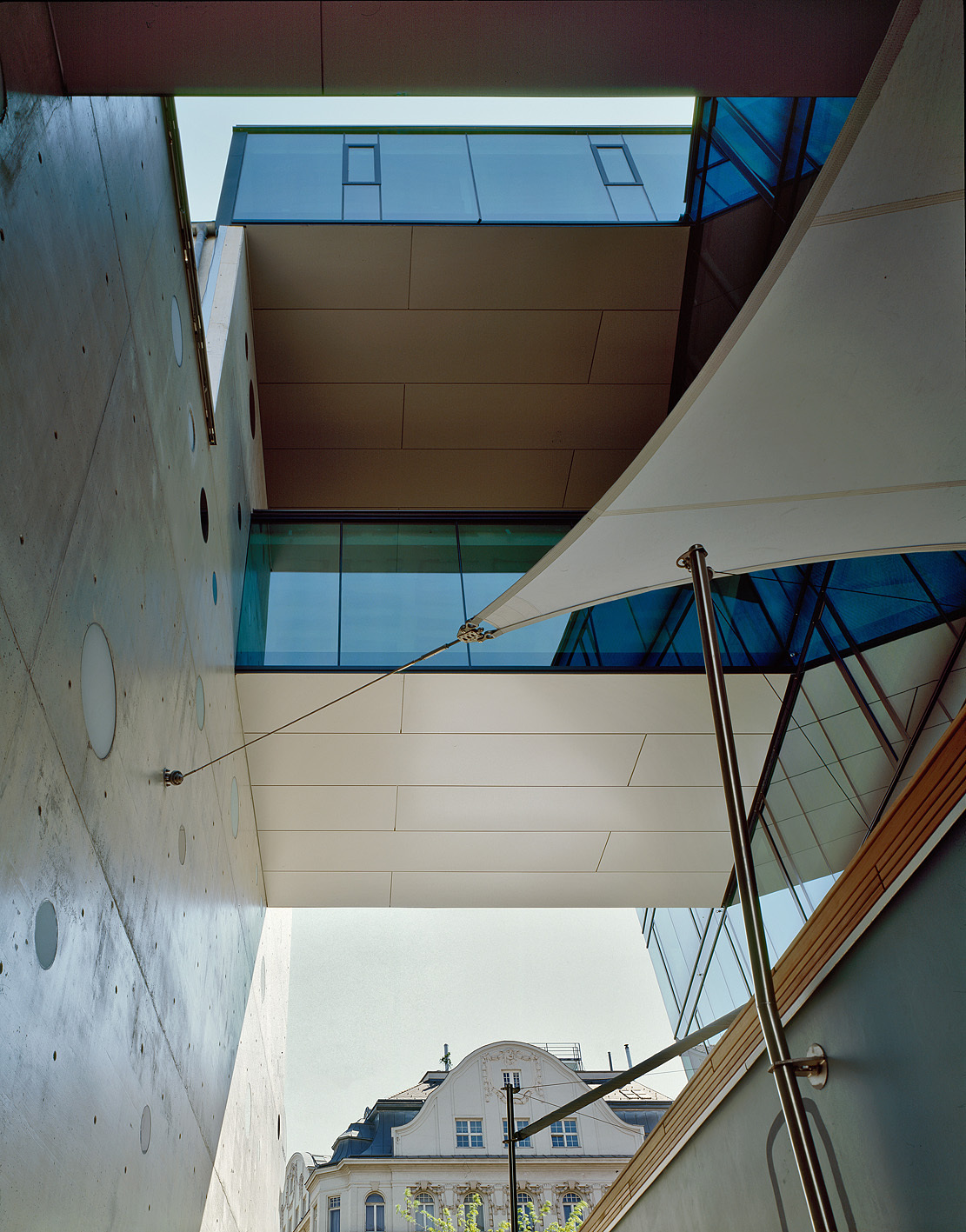 Mit dem Büro- und Geschäftshaus in der Mariahilfer Straße 36 haben die Architekten Marta Schreieck und Dieter Henke diesen Typus des Straßenhofs neu interpretiert. Zur Verfügung stand ihnen dafür eine extreme schmale Parzelle mit 17 Metern Breite und 65 Metern Tiefe, deren Bebauungsplan ein Vorderhaus, einen Innenhof mit Seitentrakt und ein Hinterhaus vorsah.