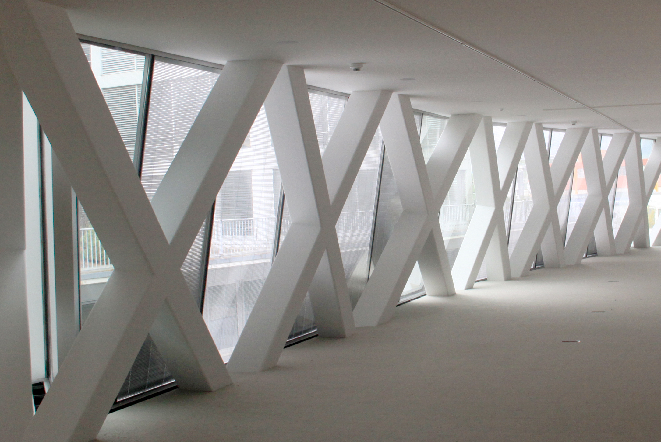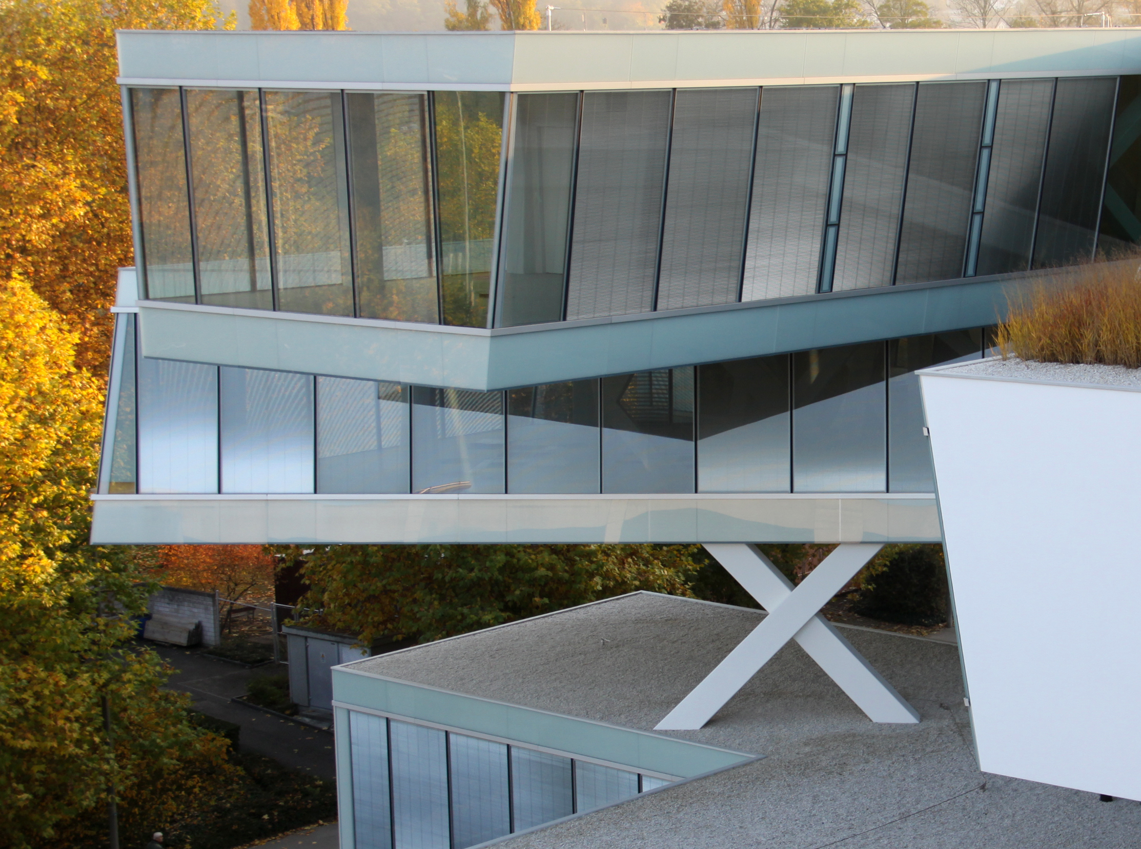 Die Stapelung ist ein wahrer Kraftakt: 1500 Detailzeichnungen waren nötig, 2500 Tonnen Stahl wurden verarbeitet, 3,8 Kilometer Fachwerkträger verschweisst. Die statische Struktur ist eine Stahlkonstruktion mit raumhaltigen Kastenträgern, die als offene Gitterstrukturen ausgebildet sind. Ein Dickicht an massiven Streben unterschiedlichen Querschnitts wuchert hinter der Glasfassade. Sie machen deutlich, welche Kräfte der Stahl aufnimmt. Die schrägen Streben überkreuzen sich zum X, wo ein Durchgang nötig ist, sind sie Y-förmig. In den unteren Geschossen ist der Strebenwald lichter, oben wird er immer dichter, er gleicht damit einem Baum, der die Lasten nach unten in den Stamm ableitet. Die schrägen Streben werden durch senkrechte Pfosten ergänzt. Sie sind Teil der Virendeelträger, welche die grossen Spannweiten und Auskragungen ermöglichen. Die Spannweiten waren aber zu gross, die Statik zu sehr ausgereizt, um die Lasten ohne zusätzliche Unterstützung abzufangen. Deshalb kommen Stützen im Aussenraum hinzu, die teilweise über fünf Geschosse frei im Raum stehen und die Balken wie Krücken stützen. Sie waren ursprünglich nicht Teil des Konzepts. Jetzt verbin- den sie den Balkenwirrwarr über die Stockwerke und führen mit ihrer wuchtigen Grösse eine neue räumliche Dimension ein. Das Prinzip des Stapelns schwächen sie aber ab.