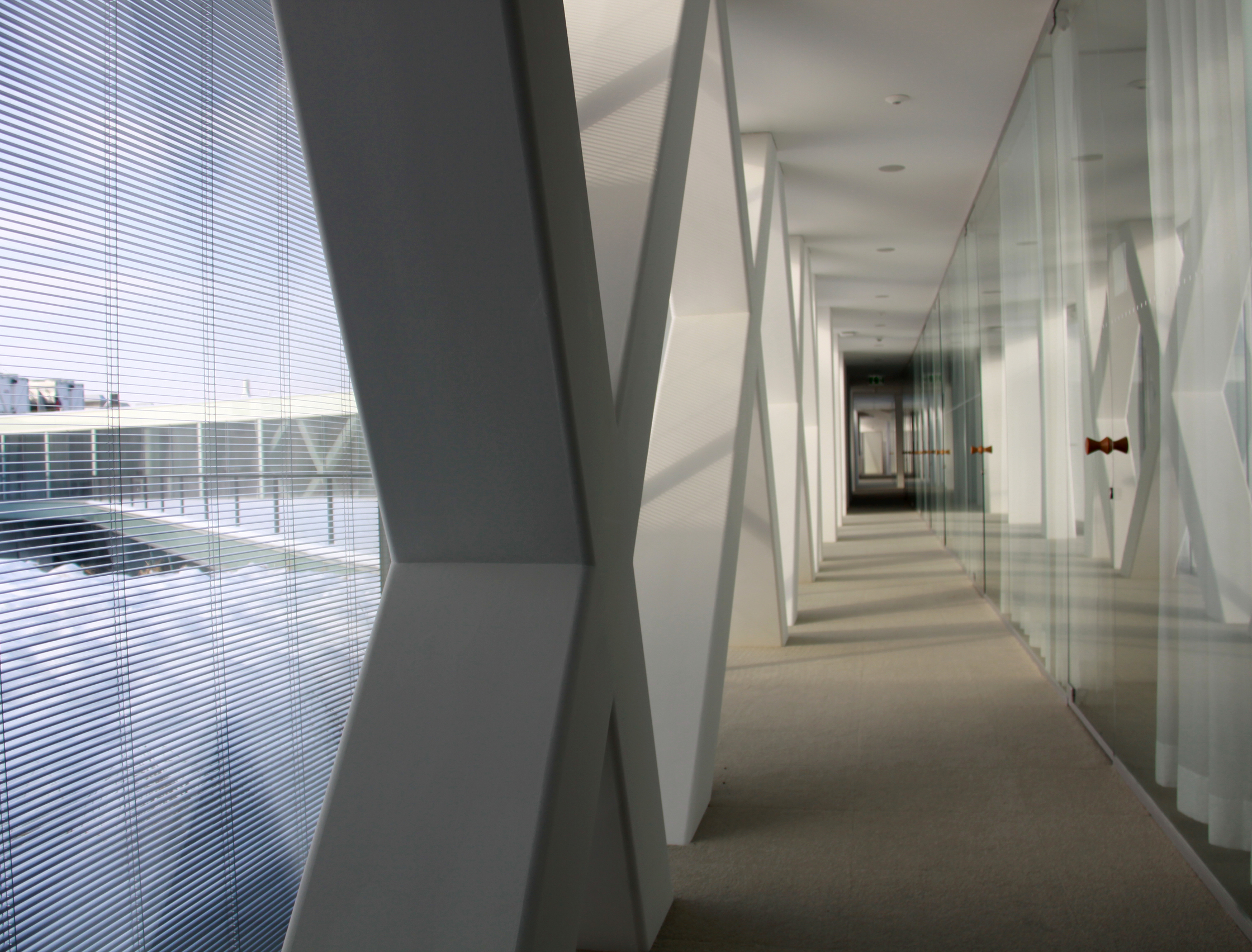 Die übrigen Geschosse sind um einen mittigen Hof organisiert, den die Bürobalken durchschneiden. Weil sie auf jedem Stockwerk anders angeordnet sind, gleicht kein Grundriss dem nächsten. Die fünf bis sieben Balken pro Stockwerk scheinen wie zufällig in allen möglichen Richtungen aufgeschichtet. Obwohl die Struktur chaotisch wirkt, ist eine gewisse Logik zu erkennen. Die Balken überlagern sich nämlich an vier fixen Punkten, an denen das Gebäude vertikal erschlossen ist. Vier Treppenskulpturen, deren Ein- und Ausgänge in Balkenrichtung zeigen, verbinden hier die Geschosse. In den schmalen Bürobalken bewegt man sich entlang der Fassade. So werden die rund 350 Arbeitsplätze erschlossen und unterwegs blickt man zur einen Seite in den Hof und zur anderen auf die Einzel- oder Grossraumbüros. Die verglaste Fassade, transparente Trennwände und weisse Oberflächen prägen die Innenräume. Der graue Teppich, helle Vorhänge und hölzerne Türgriffe sorgen für etwas wohnliche Stimmung. Die von Herzog & de Meuron für die Büros entworfenen Holztische sind nur im Restaurant zu finden. Actelion entschied sich für nüchterne, höhenverstellbare Möbel.