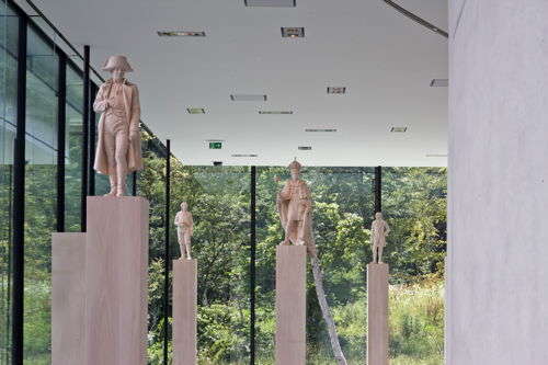 Nach dem Lösen der Eintrittskarte wandert man langsam an der Glasfassade entlang. Dramatische Kulisse. Geschnitzte Holzfiguren des Südtiroler Bildhauers Willy Verginer bieten einen ersten Vorgeschmack auf 1809. Über eine winzig schmale Rolltreppe fährt man schließlich runter in den Berg. Drängeln und Überholen unmöglich, hier gemahnt die Architektur an Ruhe und Gemächlichkeit.