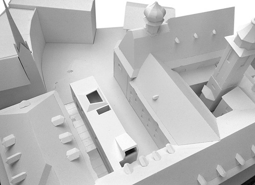 Den Endpunkt einer der beiden Straßenachsen bildete bislang ein Gebäude der örtlichen Feuerwehr. Es hielt den Hof des ehemaligen Augustinerklosters besetzt und eignete sich keineswegs als Point de vue. Als es darum ging, die im Klostergebäude untergebrachte Hauptschule zu erweitern, war dieser Bau deshalb schnell drangegeben und aus dem Architektenwettbewerb die im Grunde einzige sinnfällige und letztlich glückliche Lösung herausgesucht.