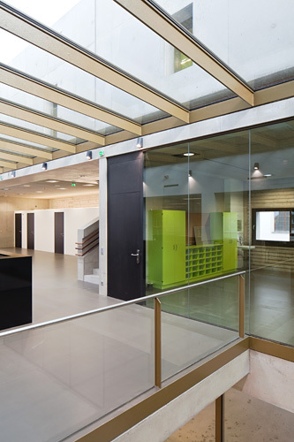 Der prominent im mittelalterlichen Stadtgefüge sitzende Neubau zeigt sich mit seiner Sichtbetonoberfläche dezidiert zeitgenössisch, passt sich durch seine Proportionen und seine sparsame Gliederung aber schlüssig in die Umgebung ein. Zum räumlichen Konzept gehört die geschickte und höchst ökonomische Mehrfachnutzung der Erschließungszone während des Ganztagsbetriebs der Schule. Die Angemessenheit der Mittel ist als Leitbild des Entwurfs direkt erlebbar und lässt trotz aller gestalterischen Disziplin den Spaß nicht außer Acht.