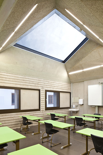 Eine nonchalante Eleganz kennzeichnet alle offenen Bereichen und den Turnsaal, der auch extern und für kulturelle Veranstaltungen genutzt wird. In den Klassenräumen dominiert eine durchaus unbeschwerte Robustheit, der man einen gewissen Retro-Charme nicht absprechen kann: Die Wandtextur bildet die Lattenstruktur der Stulpschalung im naturbelassenen Beton ab, die im Zusammenspiel mit der Holzwollestruktur der Dämmplatten an der Decke akustisch vorteilhaft und optisch einfach lässig wirkt.