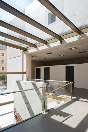 Das Material rüttelt an den Sehgewohnheiten der Rattenberger Bürger, sind sie doch farbig gefasste Putzflächen und sparsame Ornamentik gewohnt, zumindest was die Schauseiten ihrer Altstadthäuser angeht – dahinter findet sich eine durchaus reichhaltige Palette von Grau. Wer genau hinschaut, entdeckt im Betonzuschlag des Neubaus einen leicht rötlichen Ton. Er stammt vom »Tiroler Rot«, einer Marmorsorte, die im Nachbarort Kramsach abgebaut wird, wiederum einer der vier Gemeinden, aus denen sich die weit über 300 Schüler des Hauptschulverbands rekrutieren.
