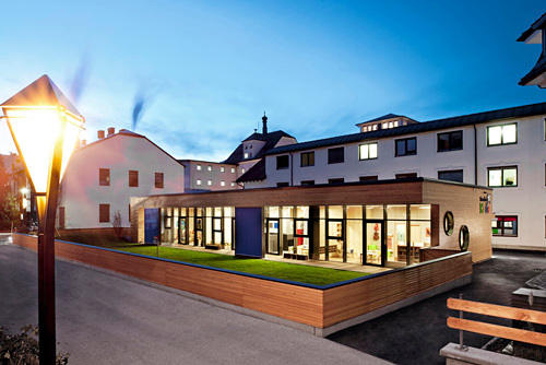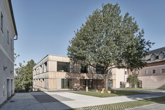 Der vom Innsbrucker Architekten Daniel Fügenschuh entworfene, hochrechteckige Baukörper nimmt gut die Hälfte des Schulhofs ein und lässt den historischen Bestand nahezu unangetastet. Trotz der Verengung auf einen schmalen Streifen bleibt genügend Hofraum übrig, der erstaunlicherweise nicht schlauchartig wirkt, dafür aber die Aufmerksamkeit auf den Hauptzugang im Altbau lenkt. Das gesamte EG ist von Nutzung freigehalten und dem Außenraum als überdachter Freibereich zugeschlagen. In seiner Kubatur und Proportion entspricht der Neubau der Körnung der Umgebungsbebauung, typischer Inn-Salzach-Architektur aus simplen Quadern ohne Giebel oder nur mit Andeutungen davon, mit flach geneigten Satteldächern meist ohne Überstand. Wie bei der Nachbarbebauung überwiegt bei dem massigen Baukörper der Wandanteil stark, nur wenige, recht kleine Fenster durchbrechen die fein gegliederten Flächen. Arbeitsfugen teilen sie in einzelne Felder auf, von denen einzelne schalglatt belassen, andere poliert oder maschinell gestockt wurden. Trotz aller gestalterischen Strenge ergibt sich daraus ein lebendiges Fassadenbild. Beide Schalen des Baukörpers wurden in kleinen Fertigungsabschnitten aus Ortbeton hergestellt – ein Verfahren, das den Bauunternehmer sehr gefordert, wenn nicht überfordert hat; einige Kanten sind bereits ausgebrochen.