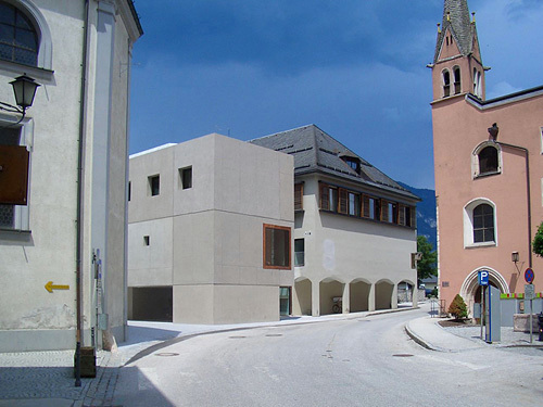 Ein noch höheres Maß an gestalterischer Aufgeräumtheit wäre sicher möglich gewesen und hätte dem Raum gut getan. Auch in der an sich diszipliniert ausgearbeiteten Straßenansicht des Foyers ist ein wenig zu viel los: Das Bild aus Fallrohren, Sockel, Fassadenriegeln, Treppenpodest und komplexer Innenraumperspektive lässt sich nur schwer beruhigen. Auch hat der Flaschner – ganz der örtlichen Tradition entsprechend – recht geräumige Einlauftöpfe für die Fallrohre gebogen und ihnen ein Sternmotiv eingeprägt. Doch das alles ist kein Beinbruch, denn der klar gestaltete Betonkörper, die Mehrfachbelegung von Verkehrsflächen und v. a. die Angemessenheit der gestalterischen Mittel im Großen wie im Kleinen haben zu einer optimalen Lösung für die Bauaufgabe und den heiklen Standort geführt. Und – darüber freuen sich Architekt und Bürgermeister ganz besonders – das Budget wurde nicht nur eingehalten, sondern deutlich unterschritten. Das Wagnis ist auf ganzer Linie geglückt.