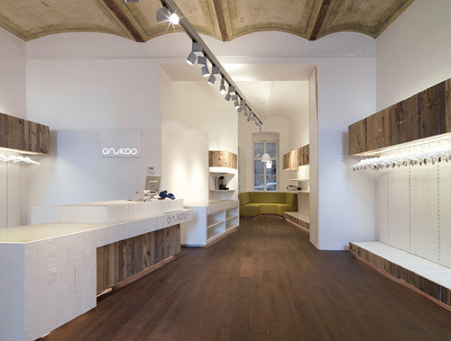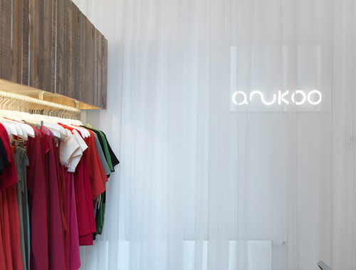 Der Schriftzug des namengebenden Labels Anukoo präsentiert sich außen wie innen dezent als immaterielle Licht-Negativform, wenn er selbst leuchtend an der Fassade und innen an der Stirnwand des vorderen Raumteils (dort hinter weißen Voile-Vorhängen) beziehungsweise als indirekt beleuchtete Aussparung in der Front der hölzernen Verkaufstheke erscheint. Indirektes Licht leuchtet auch unter dem Verkaufspult hervor, während an einer Schiene unter der historischen Decke, an der freigelegte Spuren alter Bemalung sichtbar belassen wurden, montierte Strahler die zu erwerbenden Kleidungsstücke in Szene setzen – deren Preise im Übrigen nicht höher als in den Stores der großen Einkaufsstraßen sind.