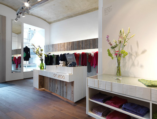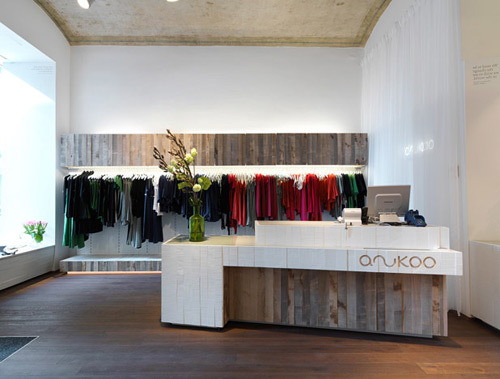 Auf die Gestaltung des Anukoo-Shops in der Gumpendorfer Straße haben diese Hintergründe – auch das ist ein Teil des neuen Images und Selbstverständnisses von Fair-Trade-Mode und ihren Konsumenten und Konsumentinnen – keinen sichtbaren Einfluss: Asia-Folklore darf man nicht erwarten. Den 70-Quadratmeter-Raum im szenig geprägten Bezirk Mariahilf kennzeichnen weiße Wände, das schöne, fahle Braun von Boden und Regalfronten, die in gewitterten, roh belassenen Eschenbrettern ausgeführt wurden, und das frische Apfelgrün eines als Miniatur-Lounge fungierenden Einbau-Sofas am hinteren Ende des Raumes.