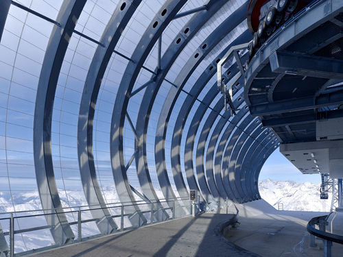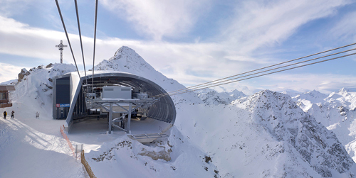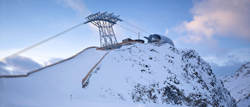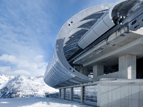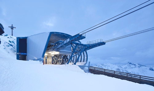 Eine filigrane Konstruktion mit hauchdünner Haut, die mit dem Berg verschmilzt: die Gaislachkoglbahn im Tiroler Sölden. Besser kann man eine Bergstation nicht in Szene setzen.