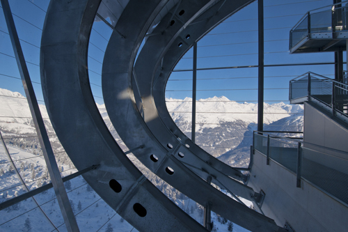 Bemerkenswert an der Bergstation ist architektonisch-formal, wie sie sich ans Gelände anschmiegt, wie sie mit dem Berg regelrecht verschmilzt. Man hat den Durchblick hinauf zum zehn Meter entfernten Gipfelkreuz, hinunter auf das fantastische Skigebiet, rundum zum dramatischen Bergpanorama. Das ist ein großes Erlebnis.