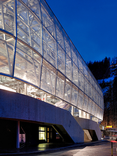 Was allen drei Stationen gemeinsam ist: Obermoser hat sie als offene, sehr transparente Räume angelegt, relativ roh, aber dem jeweiligen Standort durch dezente Maßnahmen eingepasst. Ihre Hülle ist wirklich nur Haut, ein Schutz für Leute, die sehr winterfest gekleidet sind und die Wärme eines geschlossenen Stationsgebäudes gar nicht brauchen. Das heißt, diese Stationen bestehen, von den notwendigen Nebenräumen und Zusatzeinrichtungen wie Restaurants abgesehen, aus Bahnsteig und sonst nichts. Auf die Akustik wurde sicher wert gelegt, auf den Einstiegskomfort (eben) natürlich auch.
