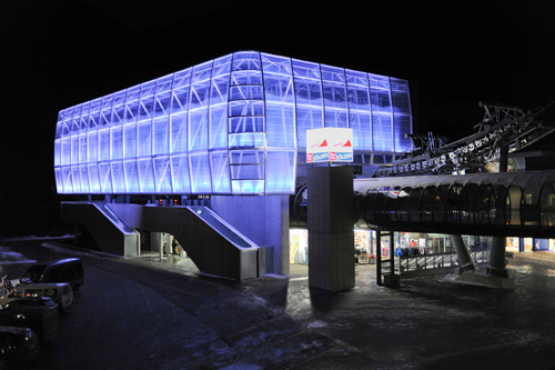 Durch die filigrane Konstruktion und die unglaublich durchsichtige Haut stellt die Station für den Ort jetzt eine Attraktion dar. Man will sich gar nicht vorstellen, was ein massiveres Gebäude seinem Umfeld angetan hätte. Obendrein: Abends stehen die (über 100) Gondeln natürlich still, was bedeutet, sie müssen geparkt werden. Und das tun sie oben, oberhalb des Bahnsteigs, als eine Art Plafond, und der ist beleuchtet. Eine höchst effektvolle Inszenierung.