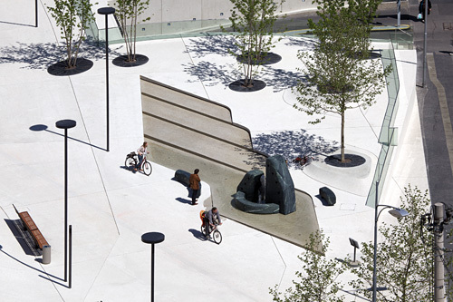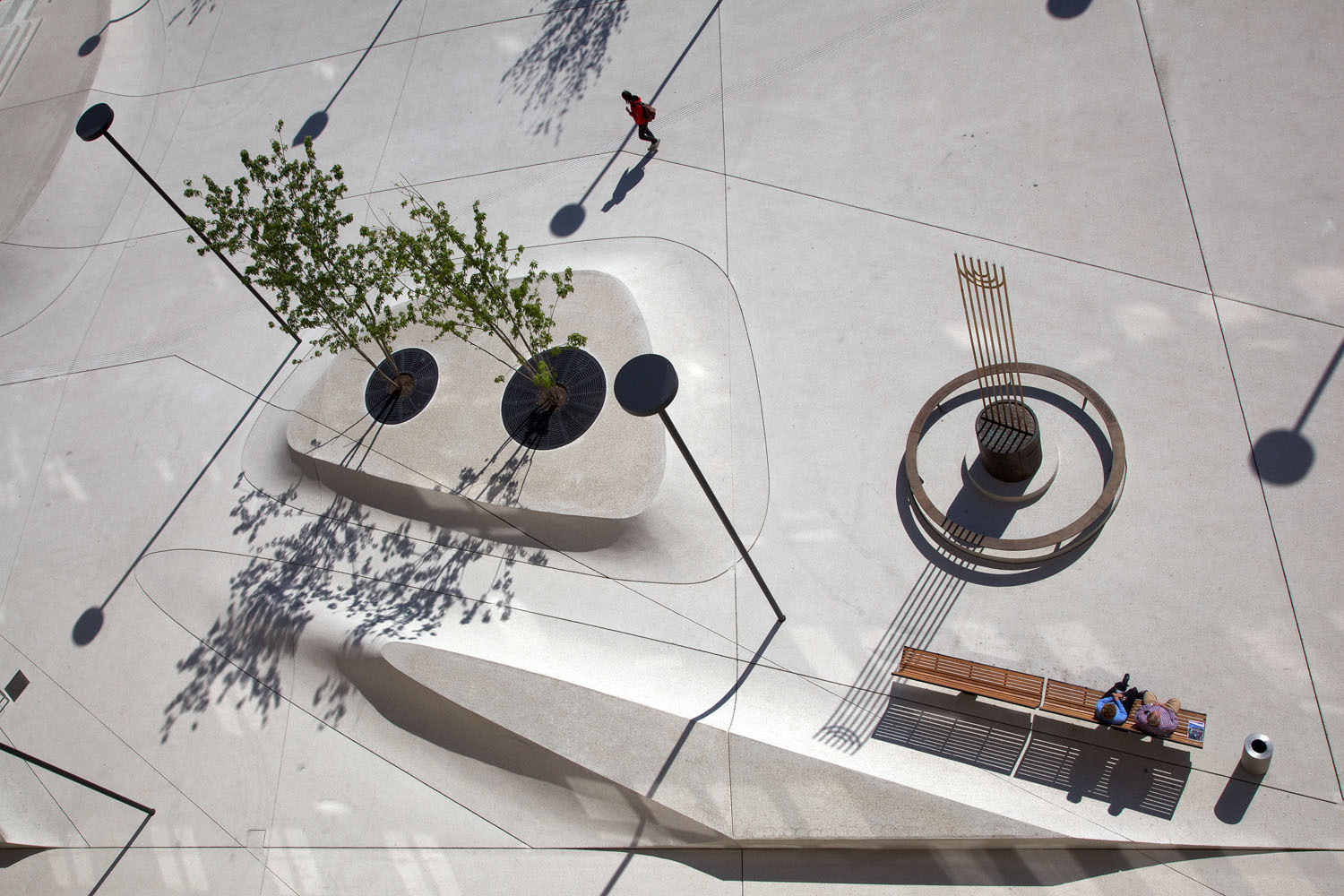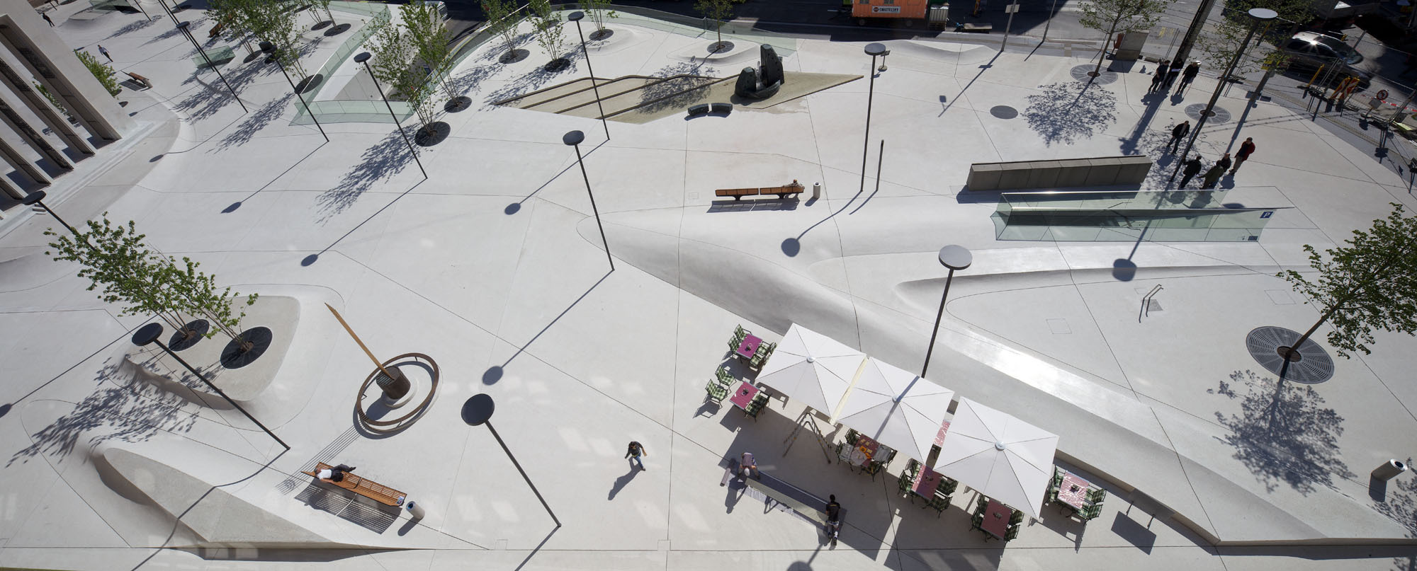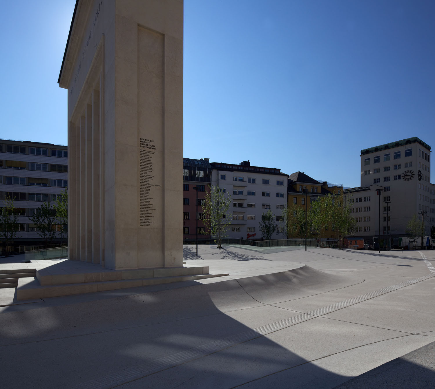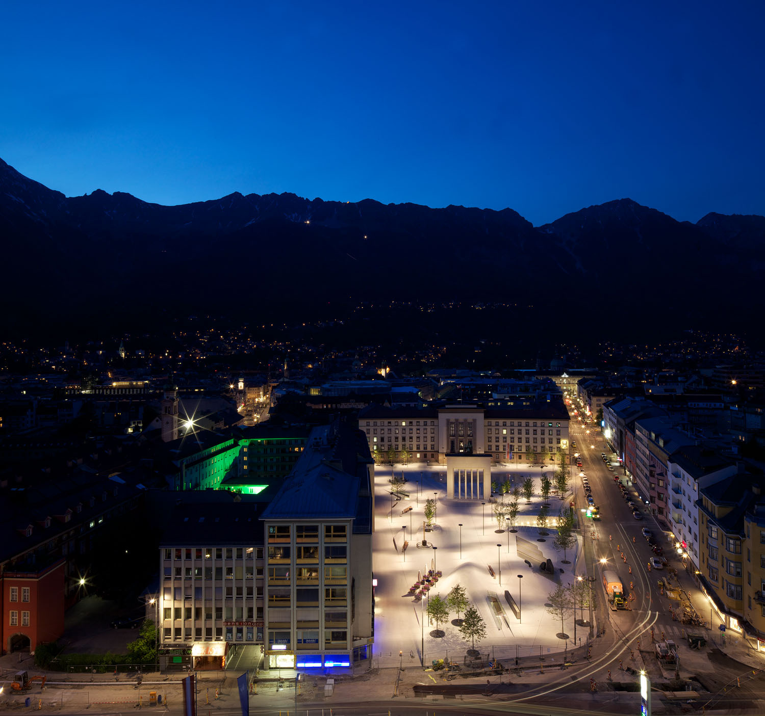 Das Team, das den Wettbewerb für sich entscheiden konnte – die Innsbrucker Architekten Kathrin Aste und Frank Lugin, die unter dem Kürzel LAAC firmieren, Johannes Stiefel vom Wiener Büro Stiefel/Kramer und der Künstler Christopher Grüner –, hat beide Aufgaben vorbildlich gelöst. Anstelle der Zweiteilung des Platzes in einen „harten“ und einen begrünten Teil ist eine durchgängige Gestaltung getreten, die auf die symmetrischen Monumentalfassaden aus der NS-Zeit mit einer plastisch gestalteten Landschaft reagiert, in die an geeigneten Punkten Bepflanzungen eingelassen sind. Als fliegender Teppich aus hellem Beton folgt sie den Bewegungsströmen der Passanten, deren meist genutzter diagonal über den Platz zur Maria-Theresien-Straße führt.