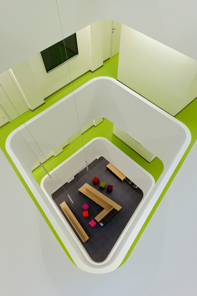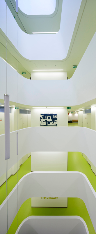 Im Sommer „Erleichterungskühlung“: Zuluftkühlung über Erdfrischluftkollektor (Lüftungsrohre mit über 2000 m Länge unter Gebäude, Temperierung über Brunnenwasser). Bauliche Vorraussetzung dafür sind speicherwirksame Massen (Stahlbetonbau und weitgehender Verzicht auf abgehängte Decken) und geringer Glasflächenanteil von ca. 25%.