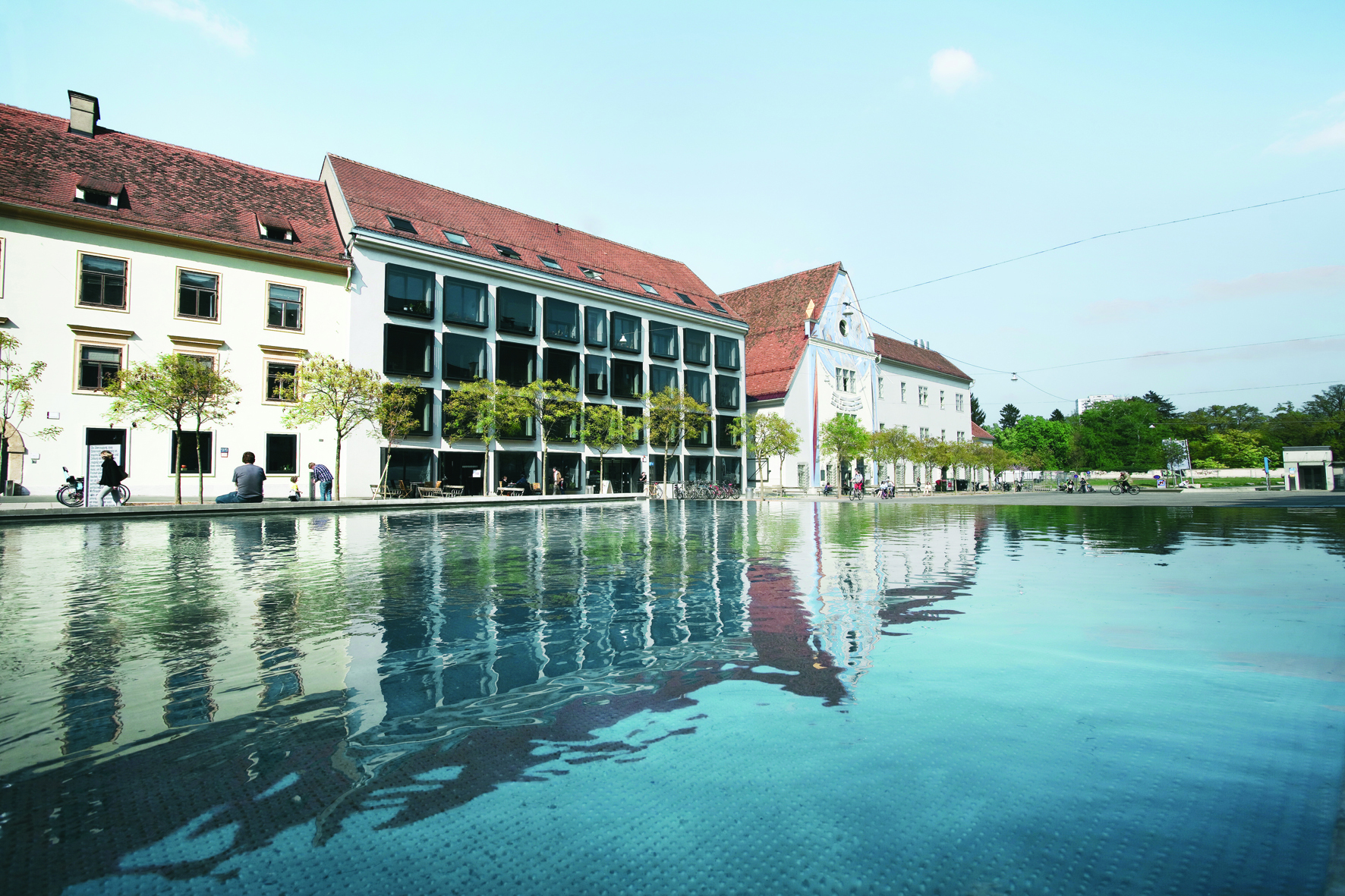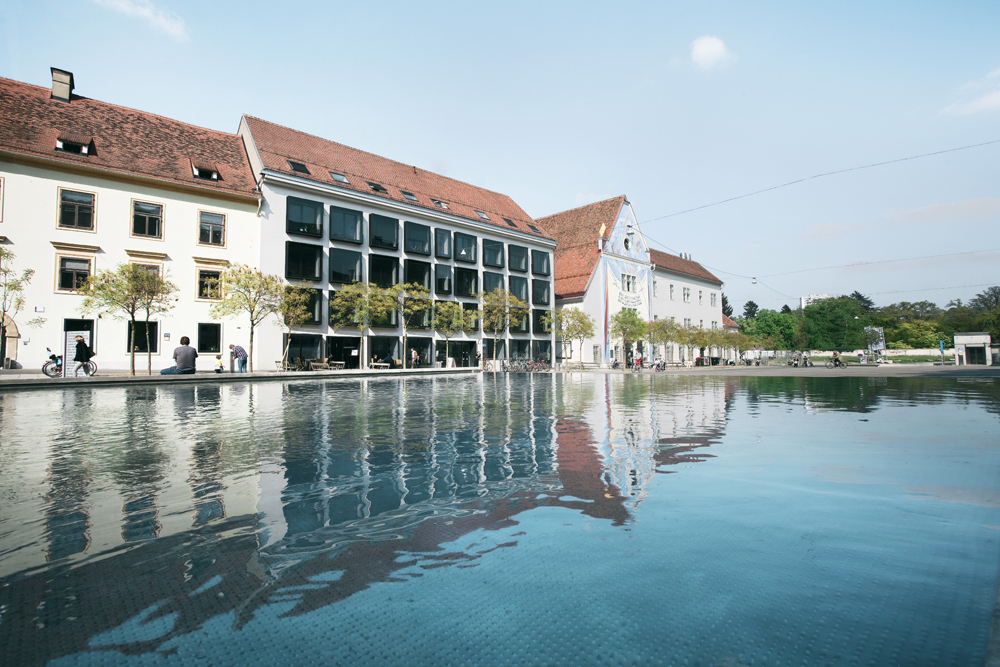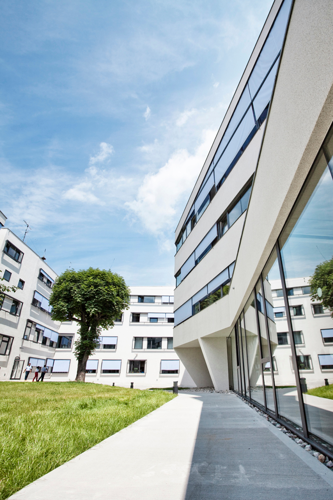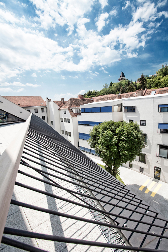 Grünfläche transformiert. Das Ensemble verbindet die Architektur des Bauwerks aus den 60er Jahren mit den Anforderungen einer modernen