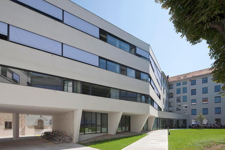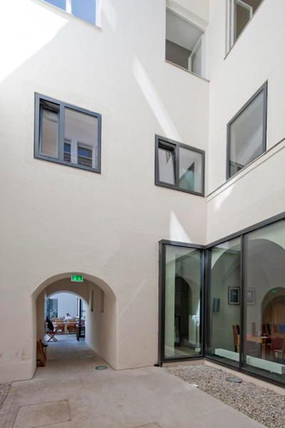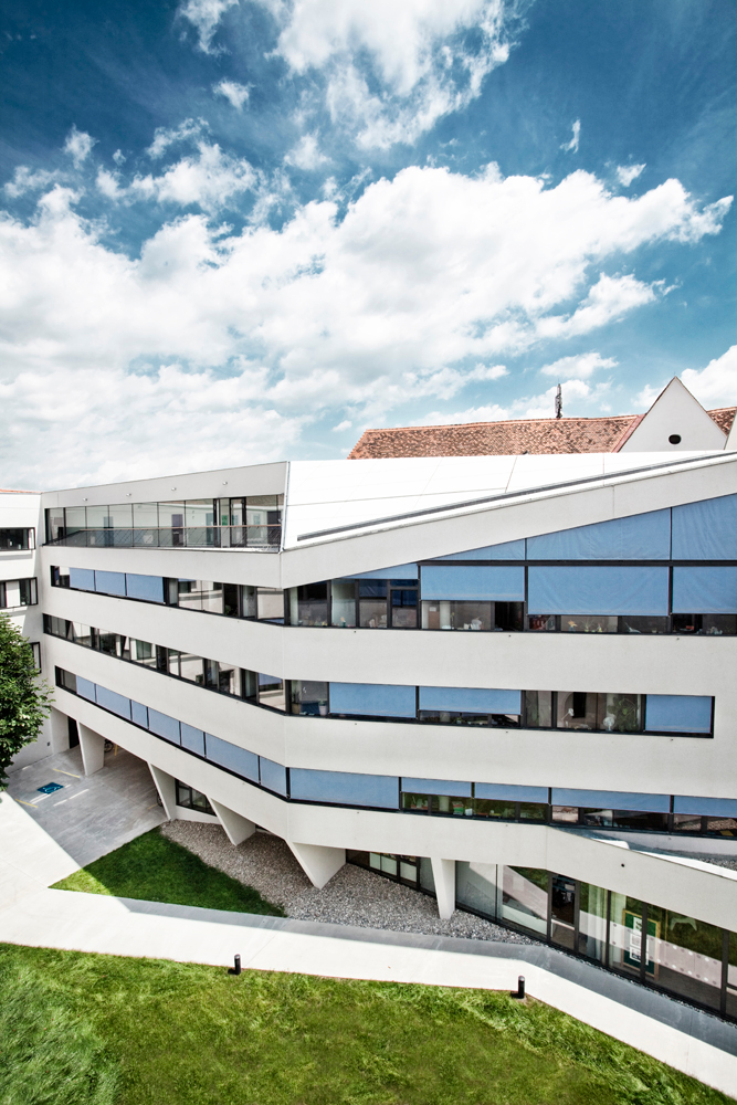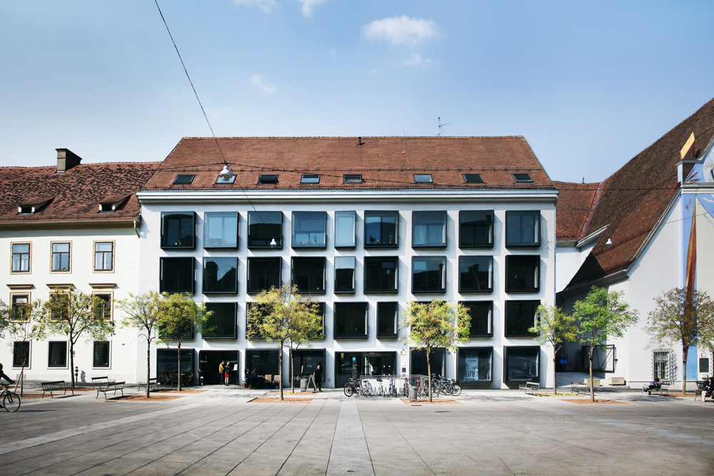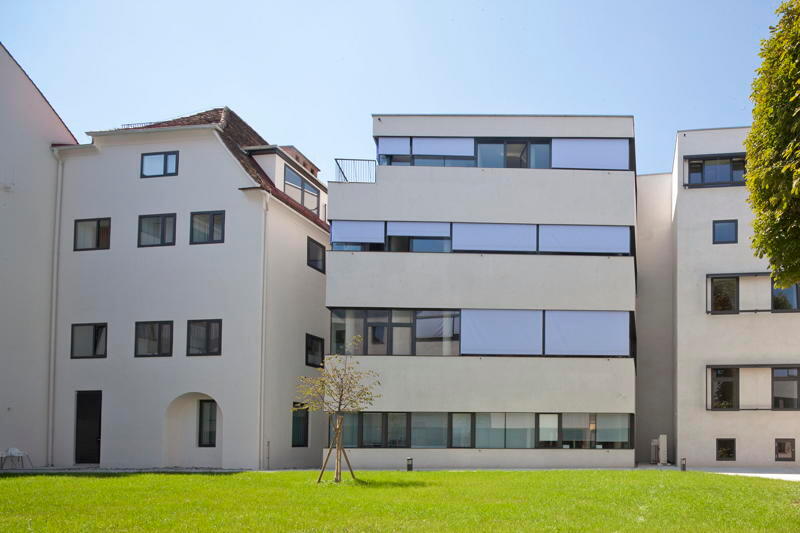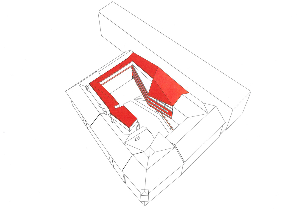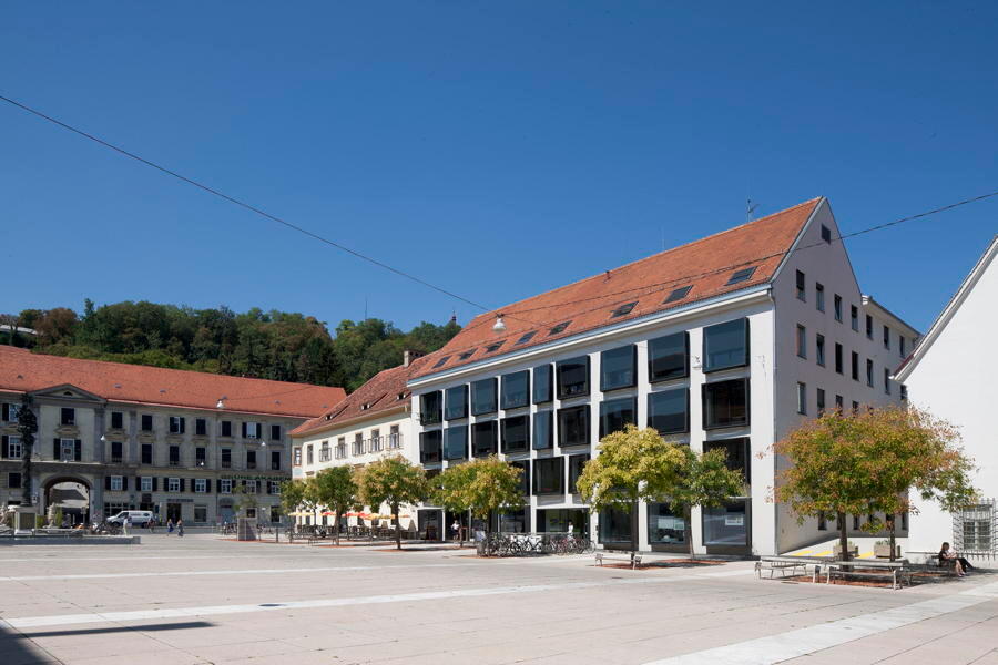 „Ein vielschichtiges städtebauliches Gefüge wird durch einen Verbindungsbau zu einem zeitgemäßen Gebäudekomplex zusammengefügt. Der Innenhof wurde vom Parkplatz zu einer