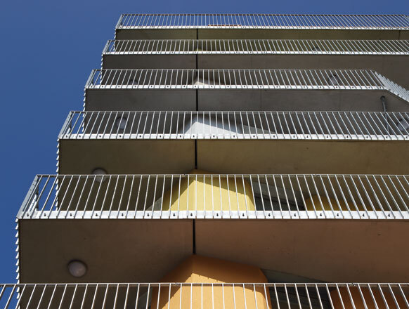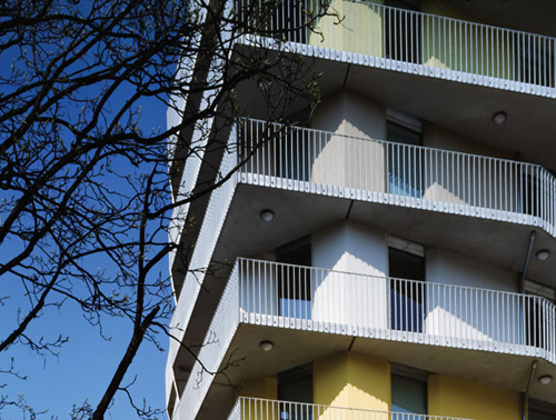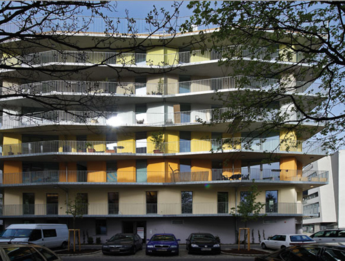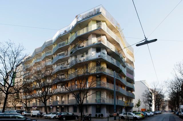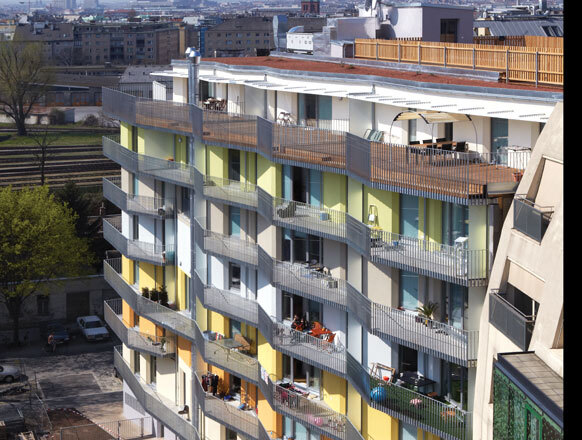 Auf einem unregelmäßigen Rechteck entwickelten sie einen Baukörper mit zentralem Stiegenhaus, der den Blockrand nicht ganz schließt, sondern zum benachbarten – noch unbebauten – Grundstück eine Fuge lässt, durch die sowohl ein angenehmer, von der Straße abgesetzter Zugang entsteht als auch die Nachmittagssonne sich den Weg zu den hofseitig gelegenen Wohnungen bahnen kann. Entlang der Kampstraße schließt es an ein vom gleichen Bauträger errichtetes und von Françoise-Hélène Jourda geplantes Wohn- und Bürohaus an. An allen drei Seiten durchgehend umlaufende Balkone sorgen dafür, dass aus sämtlichen Zimmern der direkte Zutritt ins Freie möglich ist. Keine Fensterluken also, sondern pro Wohnung zwei bis vier bis zum Boden reichende, unterschiedlich breite Öffnungen. Um diesen privaten Freiräumen einen abwechslungsreicheren und räumlich angenehmeren Zuschnitt zu geben, wurden sowohl die Gebäudehülle als auch die Balkonplatten einer Verformung unterzogen: Indem die Außenwände Knicke nach innen und die Balkonzone Knicke nach außen erhielten, entstanden Balkontiefen, die eine sinnvolle Möblierung und bequeme Nutzung begünstigen und zudem die Begrenzungsflächen zu den jeweiligen Nachbarn gering halten. Selbst die kleineren Wohnungen verfügen so noch über einen zehn Quadratmeter großen Freiraum, bei den 74 Quadratmeter großen Eckwohnungen sind es gar 25 Quadratmeter.