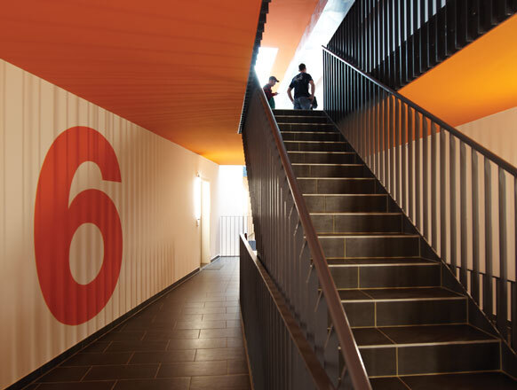 Flächen zur individuellen Aneignung stehen auch in der internen Erschließung in hohem Ausmaß bereit. Das Entree ist kein winziger Schluf, sondern eine geräumige Halle. Ein Trinkwasserbrunnen sorgt für eine rasche Erfrischung außerhalb der eigenen vier Wände. Das Stiegenhaus ist so großzügig, dass es einlädt, zu Fuß zu gehen, und mit den breiten Gangflächen zu einem angenehmen, wohl auch als Begegnungsort tauglichen Binnenraum wird. Über der Eingangszone liegt ein zwei Geschoße hoher Gemeinschaftsraum mit vorgelagerter Terrasse. Genau darüber wurde nochmals ein – diesmal zum Stiegenhaus hin offener – Raum vorgesehen, der zur Bespielung durch die Hausgemeinschaft, zum Beispiel als Wintergarten, bereitsteht.