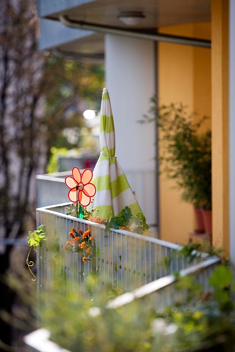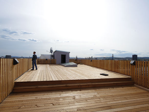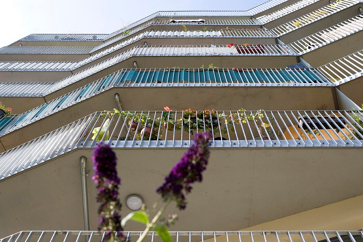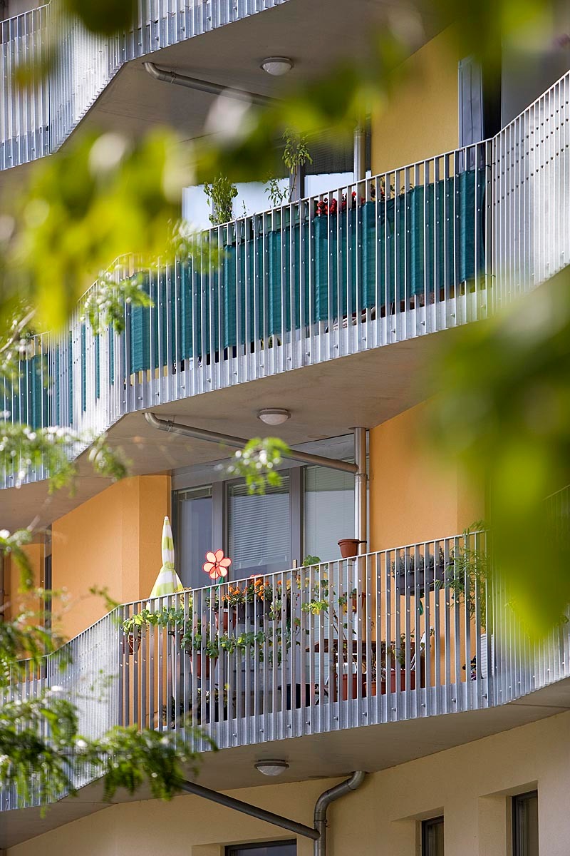 Balkone oder Loggien sind immer eine jener Zone, in der die einzelnen Bewohner individuelle Gestaltungsambitionen ausleben, oft nicht zur Freude der Architekten. Querkraft hingegen lieferte den Bewohnern gleich ein passendes Instrument, um diese Kreativität zu befriedigen und zugleich dafür zu sorgen, dass eine rasche und unkomplizierte Begrünung ermöglicht wird. In den Geländerstäben wurden Lochungen vorgesehen, in die Halterungen zur Befestigung von Blumentöpfen und Pflanzkästen eingehängt werden können. Ein entsprechendes Sortiment an Schellen und Bügeln wurde an die Bewohner bereits ausgegeben und auf so gut wie allen Geländersegmenten arrangiert. Das Thema des Begrünens wurde nicht ausschließlich an die Bewohner delegiert: Vor den Büros der Erdgeschoßzone säumt entlang des Gehsteigs ein bepflanzter Streifen das Haus, und im hauseigenen Hof wuchern Blumen, Kräuter, Gräser, Sträucher und Bäume, dass es eine Freude ist. Begrünt sind auch all jene Dachflächen, die nicht von der riesigen Dachterrasse eingenommen werden, und zwar nicht in der üblichen konventionellen, gleichförmigen Art, sondern bewusst gestaltet.
