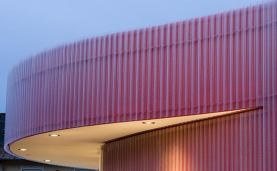 Sie besteht aus schachbrettmusterartig auf einer Stahlkonstruktion angeordneten Platten aus glasfaserverstärktem Beton, deren Größe variiert, um trotz der geneigten Flächen durchgehend die horizontalen Linien beizubehalten. Der weiße Schleier wirft Licht-Schatten-Muster auf die Umgrenzungsmauer und in die Innenräume. Er schützt vor Einblicken und bewahrt von innen vor dem direkten Blick auf die wenig attraktive Nachbarschaft, lenkt diesen aber auch durch einzelne Fenster in die „schöne“ Umgebung – auf die Berge und in den Himmel.