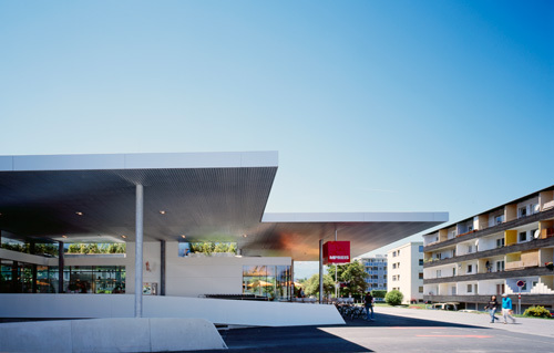 Am Innsbrucker Mitterweg schuf er zwei Bauten für Auftraggeber, die beide mehrfach baukulturelles Verantwortungsbewusstsein bewiesen haben. Für M-Preis, jene Lebensmittelmarktkette, die kontinuierlich architektonisch ordentliche, oft auch herausragende Filialen realisiert, schuf Köberl seinen nun bereits vierten Markt, und in der gleichen Straße, näher am Stadtzentrum, eine Geschäftsstelle der Bank für Tirol und Vorarlberg (BTV). Beide sind Oasen im heterogenen Dickicht der beginnenden Stadtperipherie, wo ein wilder Mix an Gewerbe- und Wohnbauten wenig städtebaulichen Halt gibt und gestalterisch dem Motto „anything goes“ gehuldigt wird. Mit dem sehr luftigen, die Horizontale betonenden Supermarkt, den er mit Durchblicken auf begrünte Dachflächen und anderen Feinheiten veredelte, absorbiert Köberl recht geschickt den rauen Charme der Umgebung.