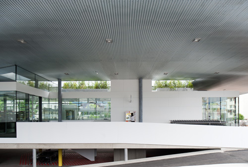 Sie besteht aus schachbrettmusterartig auf einer Stahlkonstruktion angeordneten Platten aus glasfaserverstärktem Beton, deren Größe variiert, um trotz der geneigten Flächen durchgehend die horizontalen Linien beizubehalten. Der weiße Schleier wirft Licht-Schatten-Muster auf die Umgrenzungsmauer und in die Innenräume. Er schützt vor Einblicken und bewahrt von innen vor dem direkten Blick auf die wenig attraktive Nachbarschaft, lenkt diesen aber auch durch einzelne Fenster in die „schöne“ Umgebung – auf die Berge und in den Himmel.