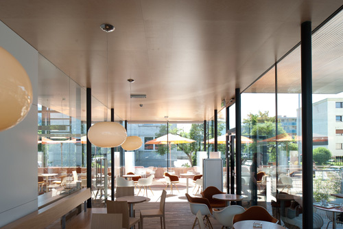 Geerdet wird die luftige Figur durch eine Betonwand, die sich um das Gebäude windet. Sie begleitet die Zufahrt in die Tiefgarage und umgrenzt zwei Refugien im Freien: ein begrüntes Atrium an der Rückseite und eine mit zwei Fächerahornbüschen ausgestattete Terrasse, die östlich an die Besprechungsräume im Obergeschoß anschließt. Die verbaute Fläche ist knapp, Köberl wusste sie raffiniert zu nutzen und hat das Kunststück zuwege gebracht, dass sich das Gebäude von innen größer anfühlt als von außen, dies auch dank einer schlichten, aber edlen Innenausstattung mit Böden aus grau-weißem Terrazzo und von Köberl maßgeschneidert entworfenem Mobiliar im Schalterbereich. „Hirnförmiges“ Nussholz hat der Architekt hier sinnigerweise eingesetzt, und damit spielt er auch auf das bei Bankgeschäften notwendige Vorausdenken an, wie auch der karierte Schleier als Metapher für das „durchaus nicht nur sichere, sondern auch fragile Bankwesens“ zu deuten wäre.